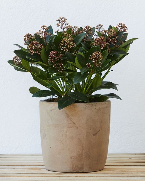 Skimmia japonica er en vintergrønn favoritt som tåler mye kulde. De rødbrune blomsterknoppene står lenge, ofte gjennom hele vinteren. Plant Skimmia i krukker eller bed før frosten kommer, gjerne sammen med lyng eller vintergrønt for et vakkert uttrykk.