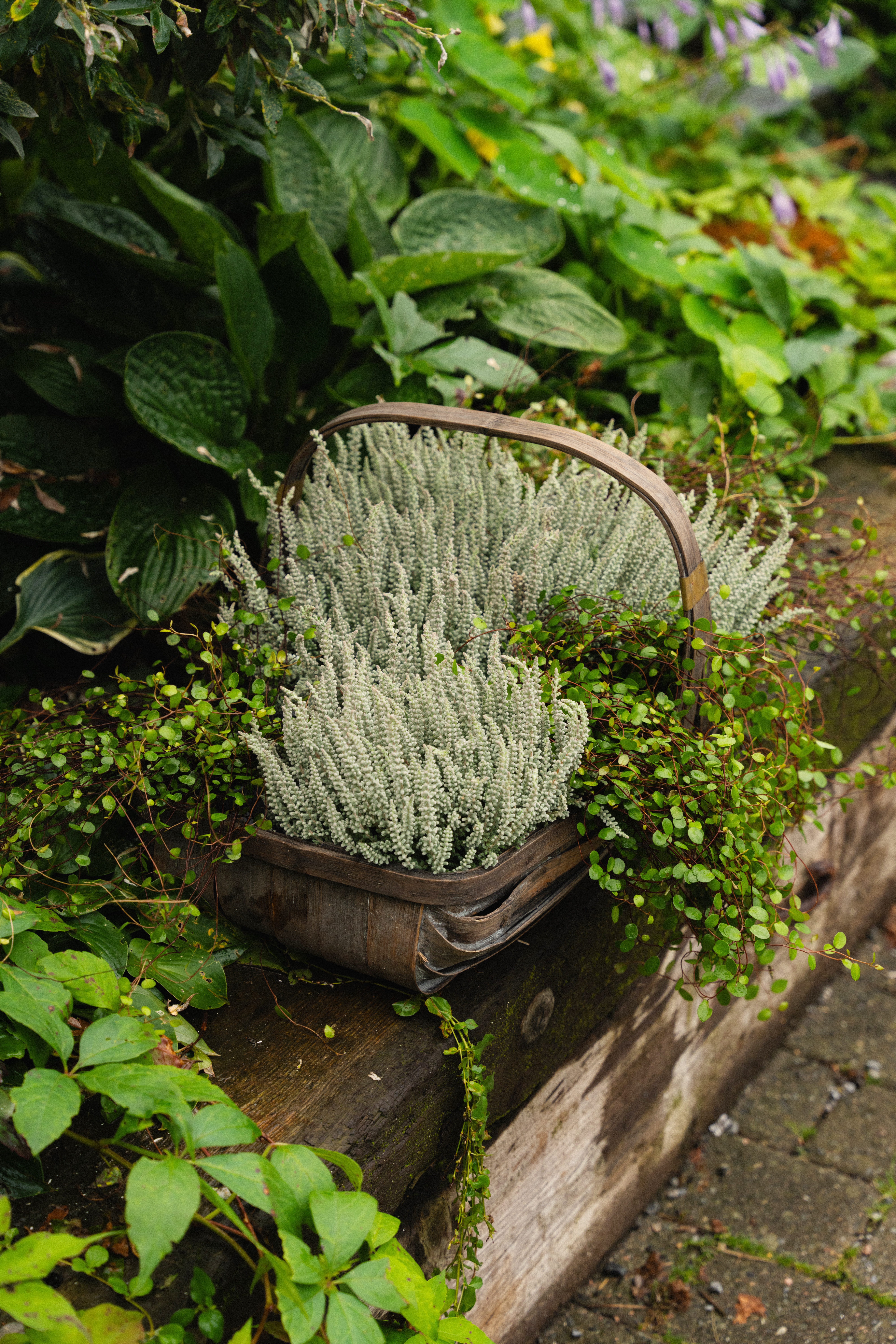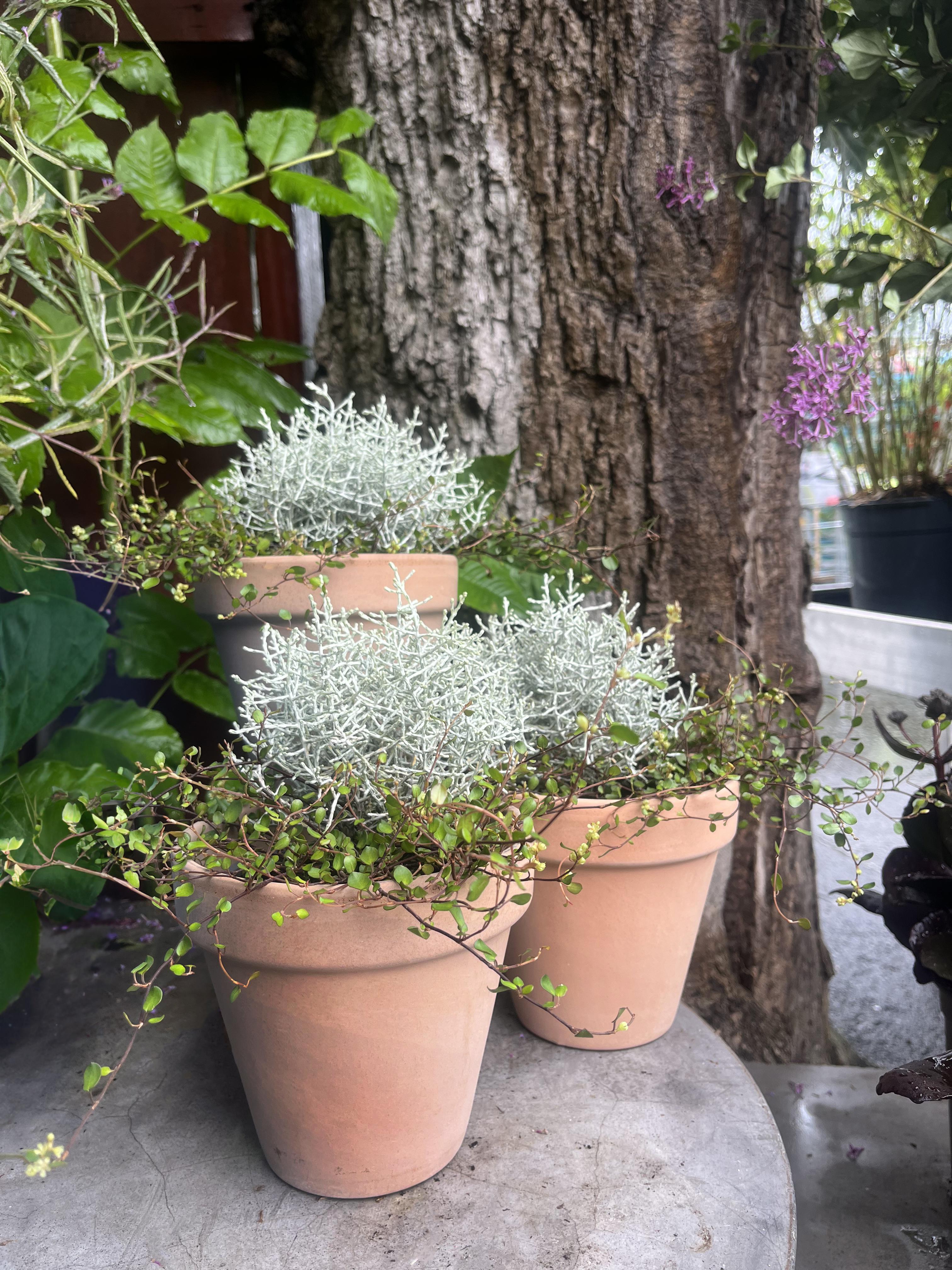 Både Eføy og Muehlenbeckia (pletter i luften) slynger seg vakkert over kanten på potter og i bed. Får de tid til å rot, tåler de både frost og snø. I potter kan du beskytte røttene mot kulde med løv eller granbar.