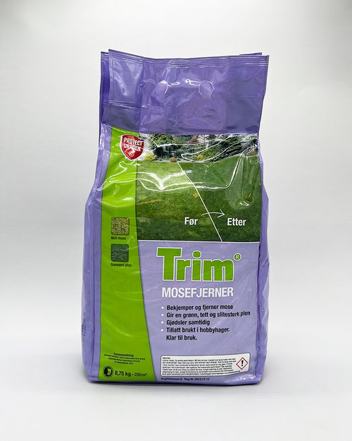 Har du mye mose i plenen holder det ikke med kalk. Da bør du heller bruke Trim Mosefjerner på mosen. Strø Trim Mosefjerner på området med mose, bruk gjerne en strøvogn. Jernsulfatet dreper mosen og nitrogenet stimulerer veksten til gresset, og middelet har derfor en dobbeltvirkende effekt. Etter 1-2 uker vil mosen bli sort og dø, og må deretter rakes bort fra plenen med en jernrive. Det beste tidspunktet for behandling med Trim Mosefjerner er tidlig om våren i mars/april eller om sensommeren når mosen er fuktig.