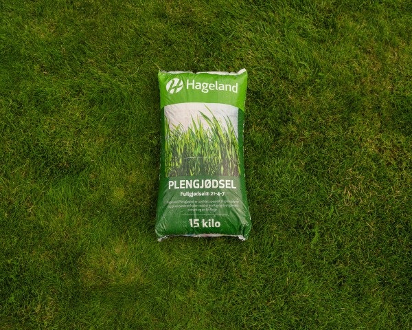 Plenen trenger mye gjødsel og trives bedre med litt ekstra nitrogen. Hageland Plengjødsel er spesielt utviklet for gressarter. Gjødsle fire ganger pr år, start med en grundig gjødsling tidlig om våren, i april. Når bakken er våt løses gjødsla bedre opp og når raskere ned til røttene. Gjødsle deretter i juni - juli - august. Nok næring til gressplenen gir en sterkere og bedre vekst av plenen.