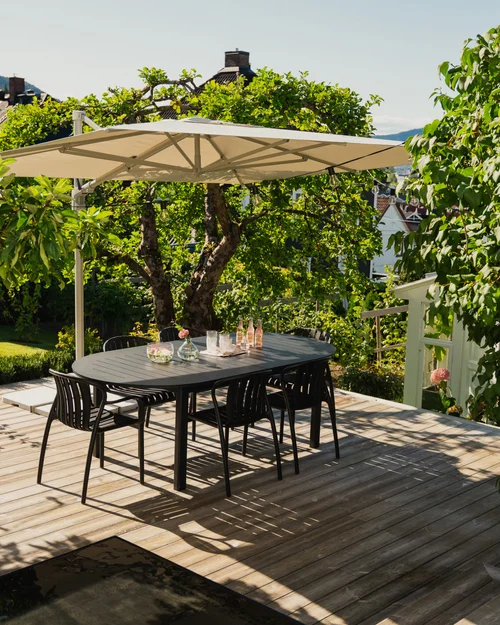 Parasollen kan du plassere ved spisebordet, loungestolen eller der barna leker. Hvis plassen tillater det, er det fort gjort å skape en liten «strand» med et plaskebasseng og en praktisk parasoll. Mulighetene er mange!