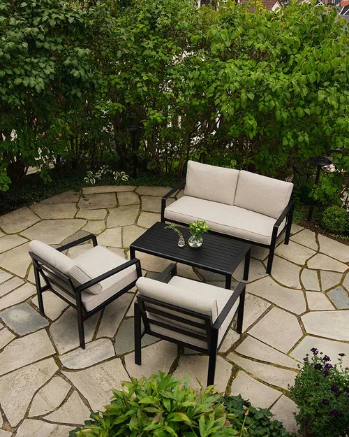 Sofagrupper i aluminium eller kunstrotting er populære fordi de tåler vær og vind godt og krever lite vedlikehold.