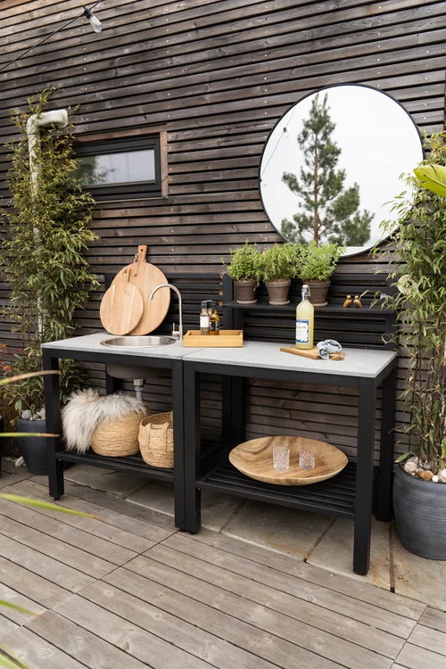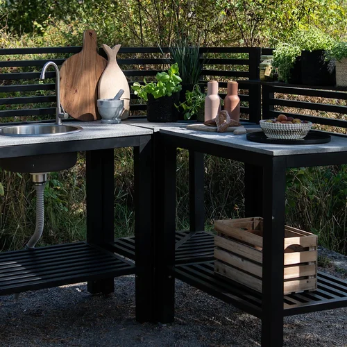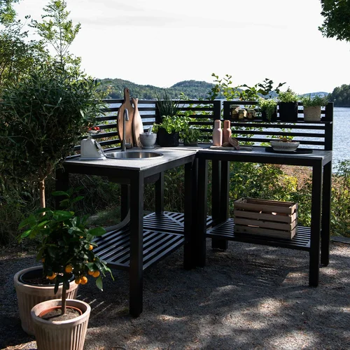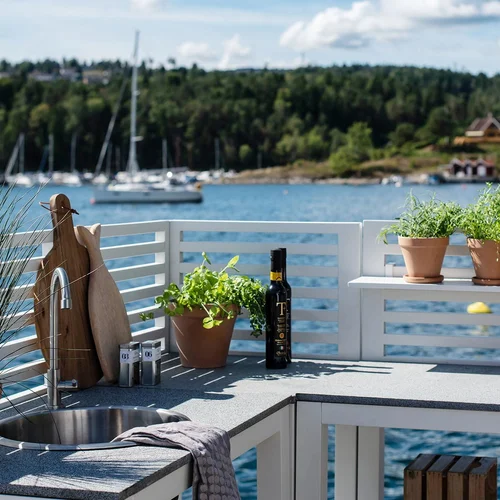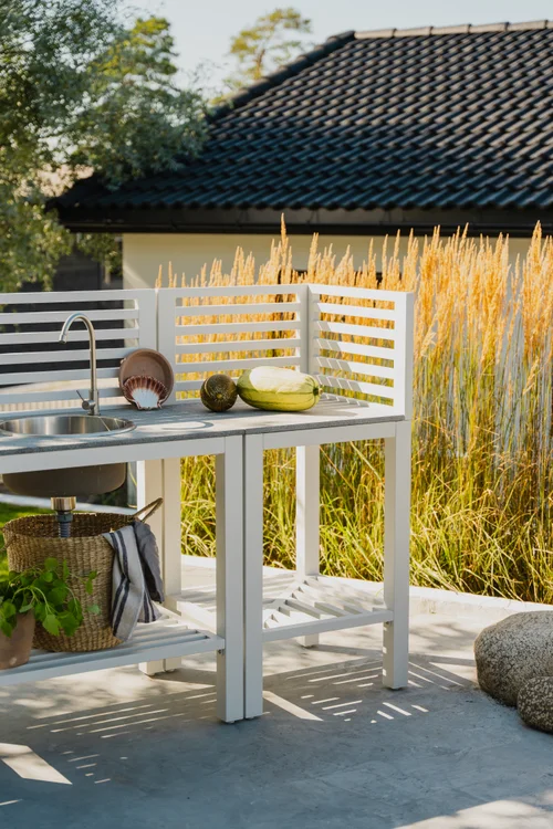 Et utekjøkken gjør det enkelt å tilberede måltider i det fri. Det er et hagemøbel skapt for gode, sanselige opplevelser. Glem å stå inne med matlagingen når solen skinner og vinden blåser svalt. Lag ditt eget drømmekjøkken utendørs. Hos Hageland finner du flere varianter fra Bellac med smarte løsninger, i hvit og sort aluminium med steinplate, med eller uten vask.