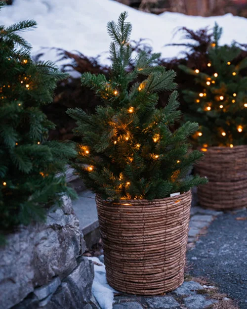 Med kunstige små juletrær, girlandere og kranser kan du pynte opp på trappa, inngangspartiet eller andre steder du vil skape julestemning. Kunstige småtrær kan settes i kurver eller potter og har LED-lys. En grønn og fyldig julekrans hører julen til. Dørkransene er i mange ulike størrelser og har LED-lys. Heng den på inngangsdøren og ønsk gjestene varmt velkommen. Girlandere kan brukes både ute og inne, og gjør det enkelt å dekorere stolper eller rekkverk. Våre varianter har LED-lys med timer, slik at du sparer batteritid. Vi har også modeller med støpsel. Se det store utvalget av prisgunstige kunstige kranser, små juletrær og girlandere i god, naturtro kvalitet hos Hageland.