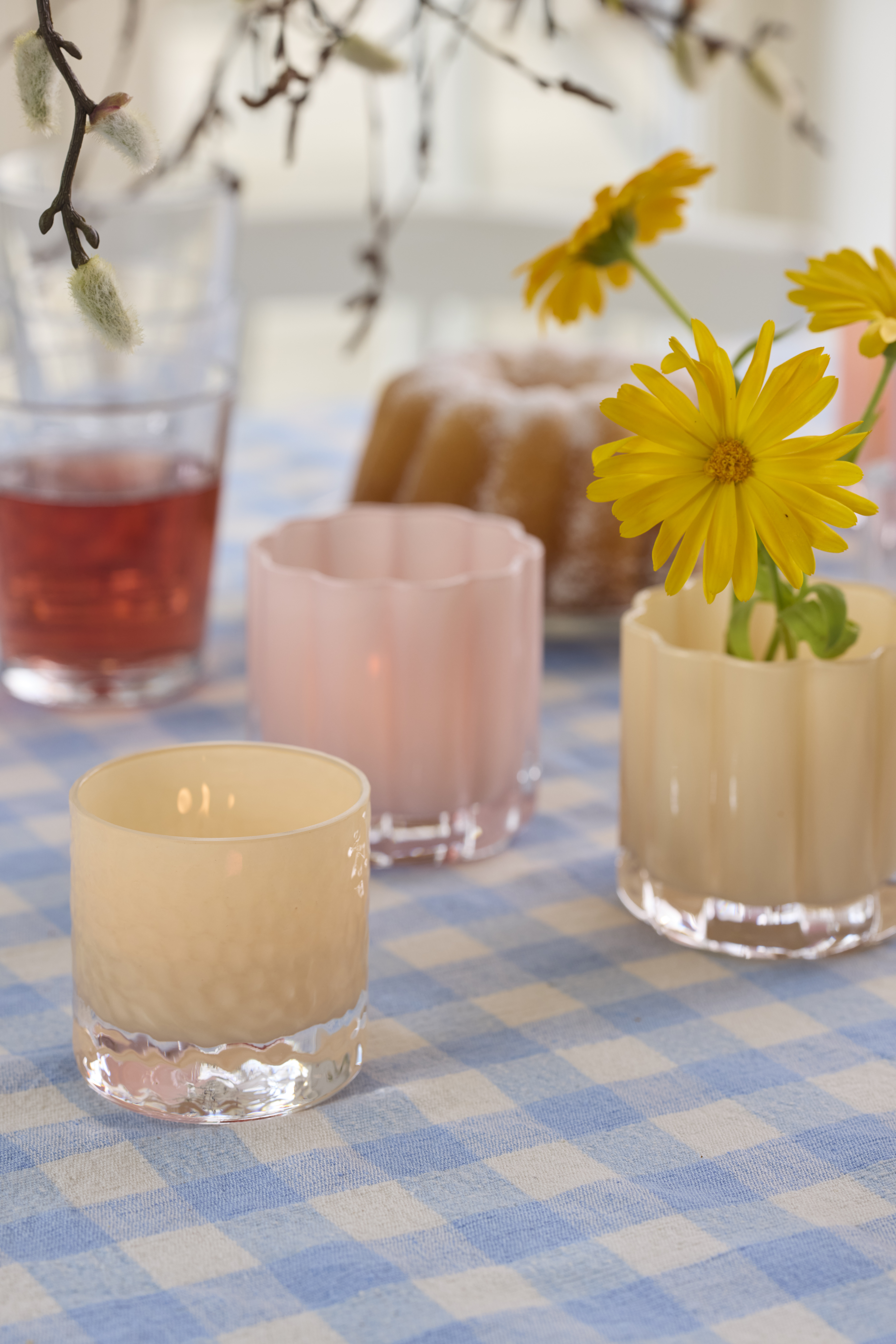 Søt telysholder i glass. 3 assorterte farger. Pris per stykk.