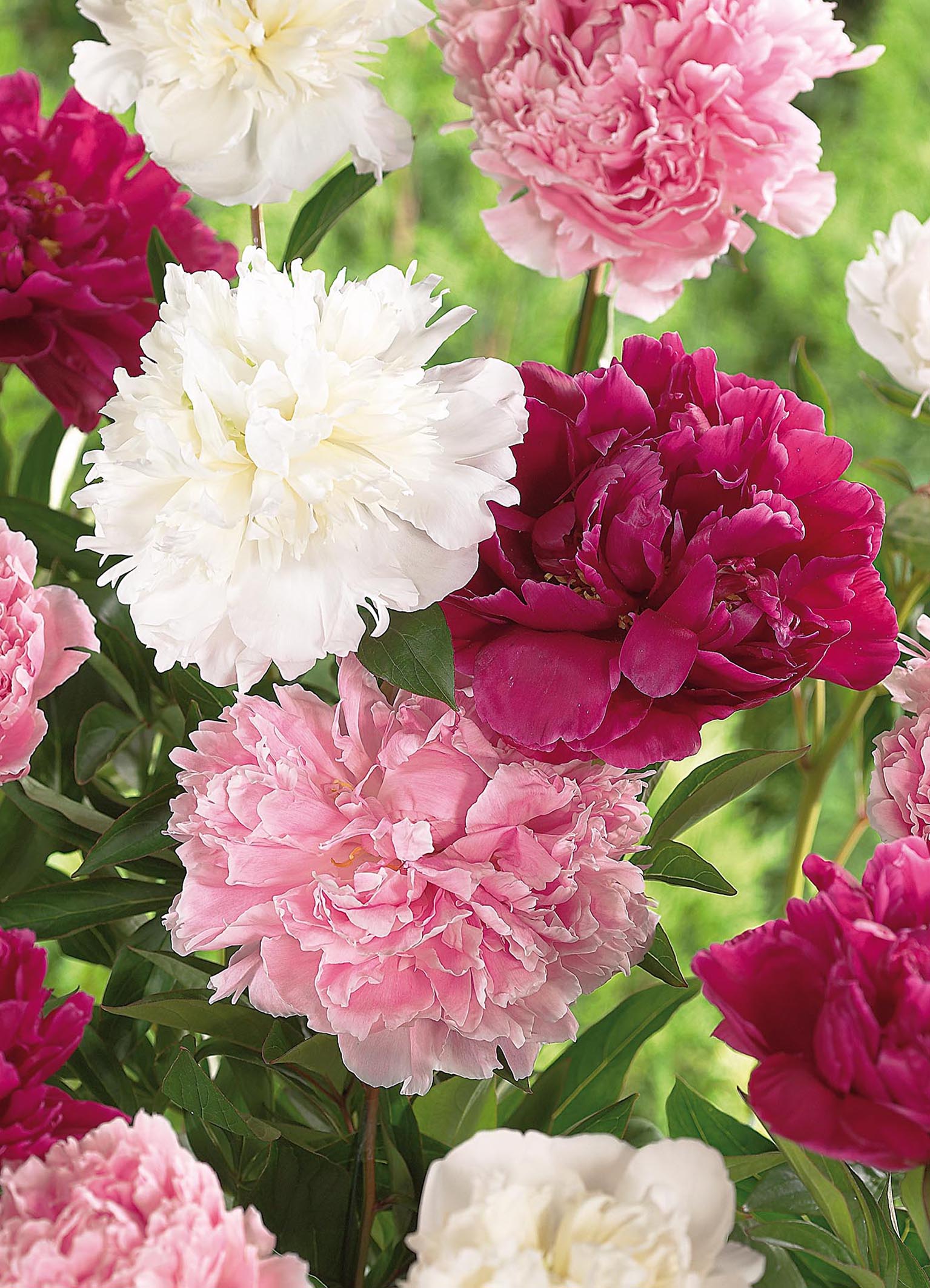 Mix med silkepeoner, også kalt Paeonia, som gir fylte blomster i purpur, rosa og hvitt. De blomstrer tidlig sommer og gir et romantisk uttrykk i både bed og buketter. Plant røttene i solrik til halvskygget plass i godt drenert jord, sett dem grunt og vann jevnt. Gi støtte ved behov og la bladverket visne ned naturlig etter sesongen.