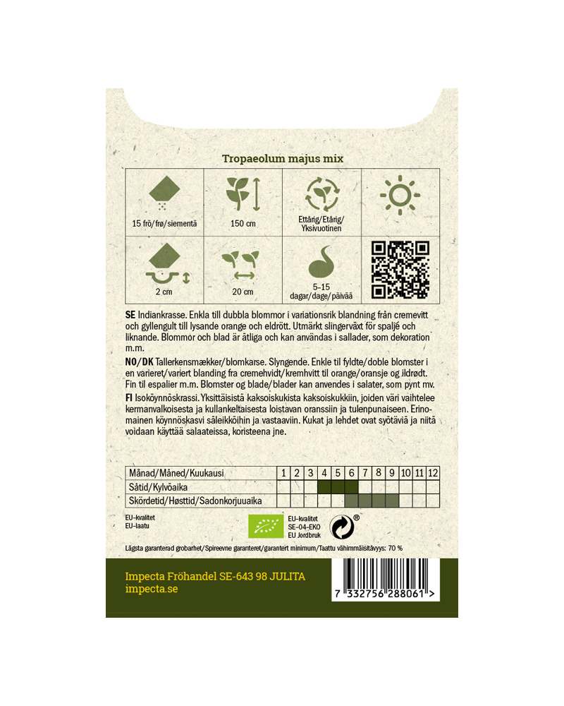 Enkle og mer eller mindre doble blomster i blanding av kremhvitt, gyllengult, oransje og ildrødt. Slyngplante som blomstrer rikt. Blomster og blader er spiselige.Dyrking fra frø:Forkultiveres innendørs i såjord i april. Dekkes med klar plast utstyrt med luftehull. Plantes ut etter herding når faren for frost er over. Kan også sås direkte på friland i mai-juni. Døde blomster fjernes fortløpende.