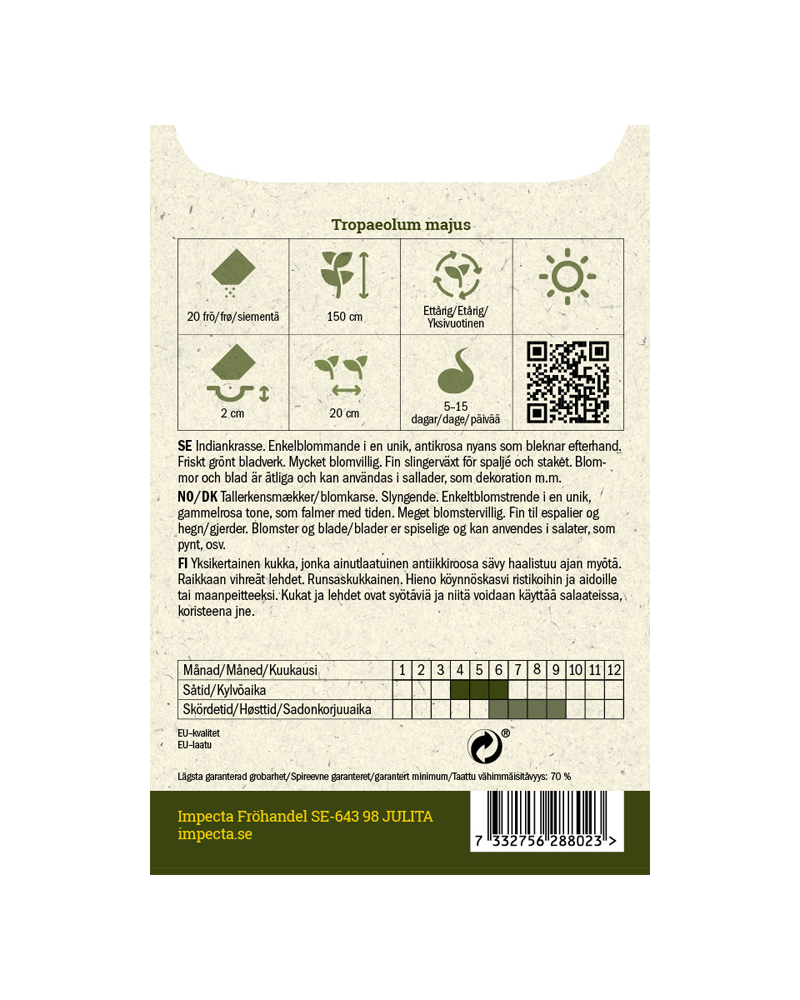 Enkle blomster i gammelrosa nyanser som blekner etter hvert. Friskt grønt bladverk. Svært blomstringsvillig. Fin slyngplante og markdekker. Blomster og blader er spiselige. Dyrking fra frø: Forkultiveres innendørs i såjord i april. Dekkes med klar plast utstyrt med luftehull. Plantes ut etter herding når faren for frost er over. Kan også sås direkte på friland i mai-juni. Døde blomster fjernes fortløpende.