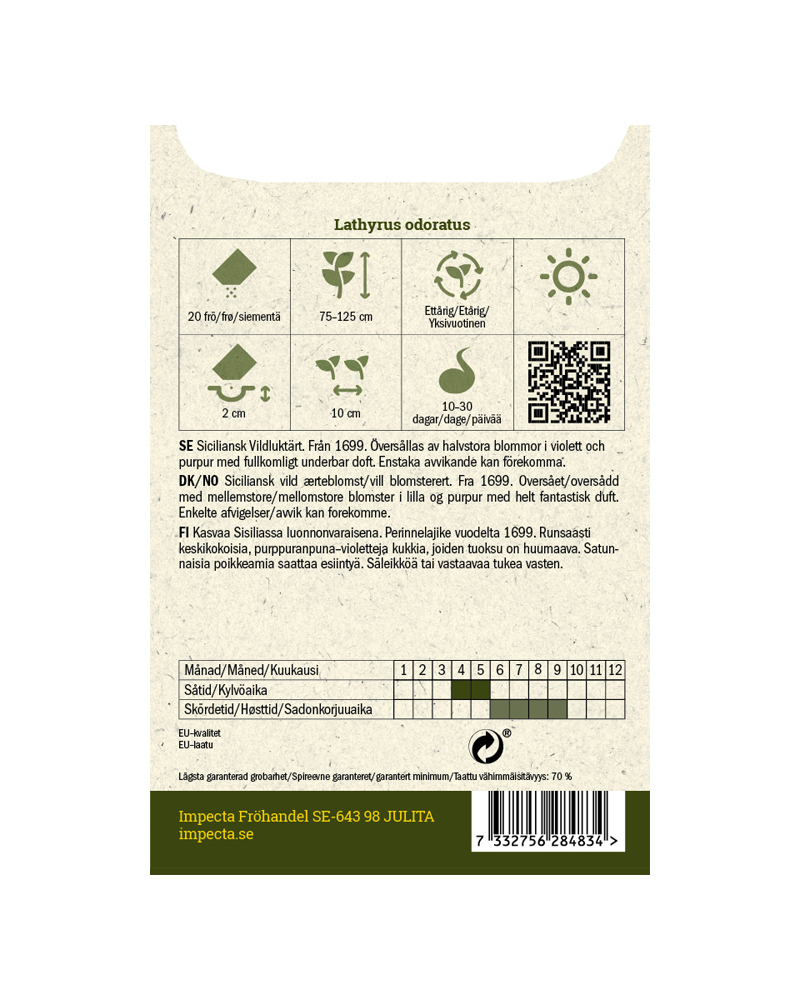 ‘Franciscus Cupani’ er en klassisk blomsterert med intens duft og fiolette og purpurfargede blomster. Den passer perfekt til espalier, blomsterbed og buketter, og gir hagen et romantisk preg. Så frøene innendørs i såjord ved 18–20 °C og sett plantene lyst og svalt etter spiring. Plant ut etter herding når frostfaren er over, eller så direkte på friland når jorden er varm. Topp ved 7–10 cm for mer forgrenede planter, og fjern visne blomster fortløpende for lengre blomstring. Ideell for deg som ønsker en hage med klassiske, duftende blomster.