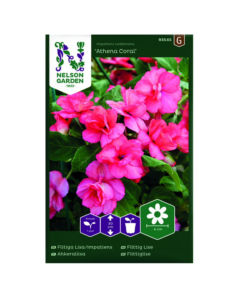 Riktblomstrende skjønnhet med store, vakre halvdoble og doble korallfargede blomster. En ekte kjempe som er villig til å blomstre selv i skyggefulle omgivelser. Planten tåler en regnfull og kald sommer, men må tas inn før første frost. Fin potteplante. Trives i godt gjødslet løs jord, vann rikelig. Topp plantene for at de skal bli kraftige.