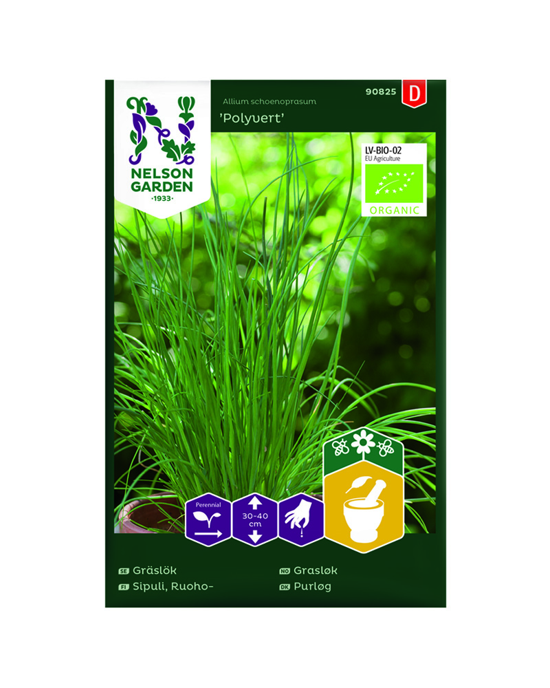 Økologiske frø. Denne sorten gir smale blad med fantastisk aroma og mild løksmak. Blomstrer med lilla, små blomster. Bladene høstes etter hvert. Blomstene kan også spises og er svært fine å dekorere med. Økologisk risikokategori SE - se artsdatabanken.no