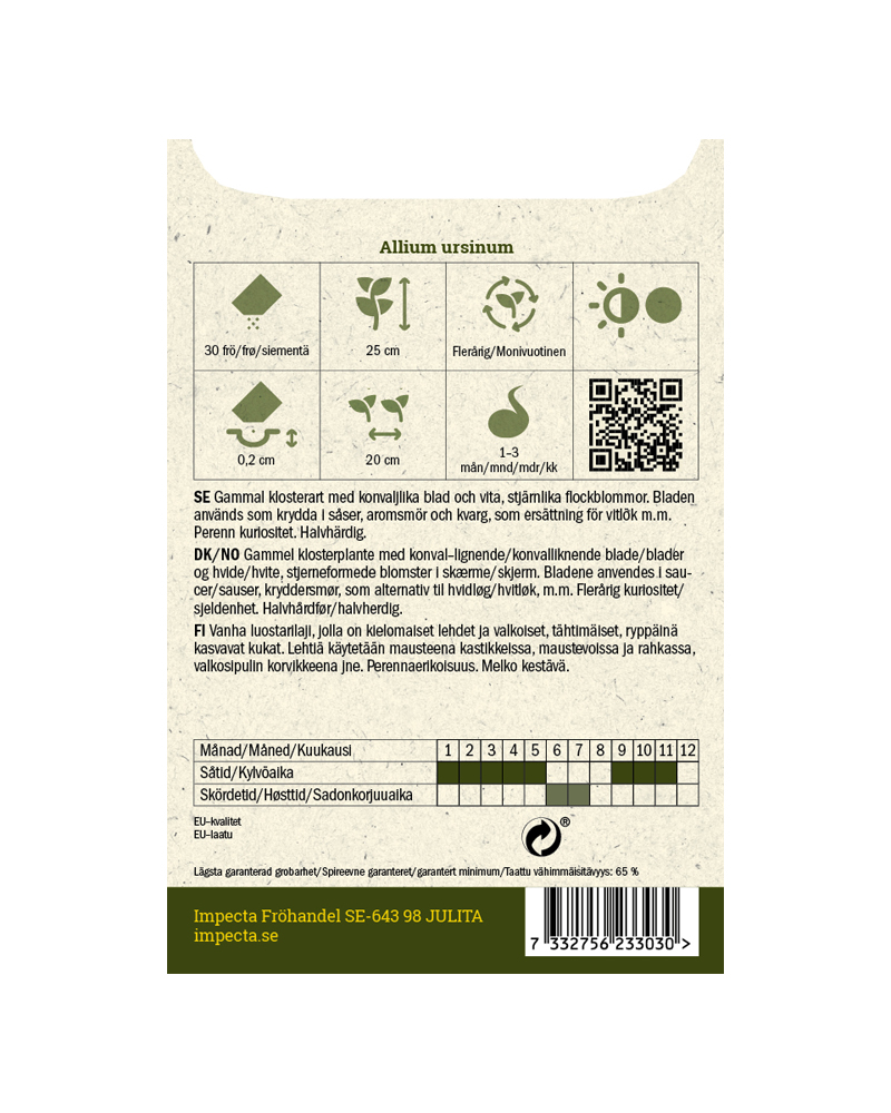 Gammel klosterart med konvalliknende blader og hvite, stjerneformede blomster i skjerm. Bladene brukes som krydder. Flerårig sjeldenhet. Dyrking fra frø: Sås innendørs i jan.-mai. Dekkes med et tynt lag grus eller perlitt. Hvis spiring ikke har inntruffet innen en måned, settes pottene i kjøleskap i ca. en måned. Deretter utendørs i skyggen. Kan også sås utendørs, evt. i kalddrivhus, i sep.-nov. Pottene kan med fordel settes på sand eller friland avsatt til dyrking.
