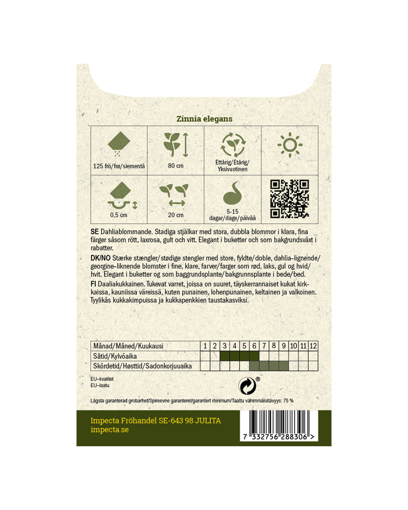 Daliablomstrende. Solide stilker med store, doble blomster i klare, fine farger som rødt, lakserosa, gult og hvitt. Elegant i buketter og som bakgrunnsvekst i blomsterbed.Dyrking fra frø:Forkultiveres innendørs i såjord i mars-april. Dekkes med klar plast utstyrt med luftehull. Settes i 20-25 °C, lyst og svalt etter spiring. Plantes ut etter herding når faren for frost er over. Kan også sås direkte på friland når jorden har blitt varm.