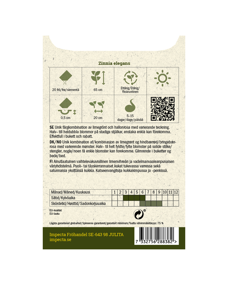 Fargekombinasjon av limegrønt og bringebærrosa med varierende tegninger. Halv- til heldoble blomster, noen enkeltblomster kan forekomme. Slående i bukett og blomsterbed.Dyrking fra frø:Forkultiveres innendørs i såjord i mars-april. Dekkes med klar plast utstyrt med luftehull. Settes i 20-25 °C, lyst og svalt etter spiring. Plantes ut etter herding når faren for frost er over. Kan også sås direkte på friland når jorden har blitt varm.