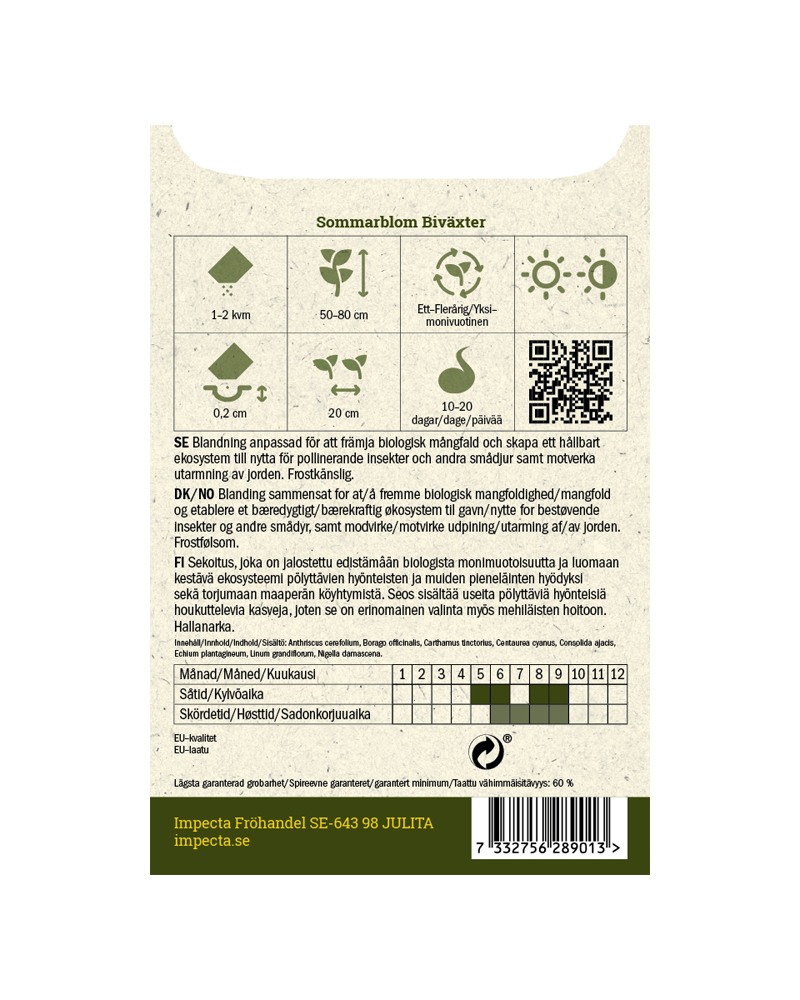 Blanding som er sammensatt for å fremme biologisk mangfold og skape et bærekraftig økosystem til nytte for pollinerende insekter og andre smådyr, samt motvirke utarming av jorden.Innhold: Anthriscus cerefolium, Borago officinalis, Carthamus tinctorius, Centaurea cyanus, Consolida ajacis, Echium plantagineum, Linum grandiflorum og Nigella damascena.Dyrking fra frø:Sås direkte på friland når jorden er varm. Forbered jorden ved å grave og krafse den. Vann jorden godt før såing. Bland 1/4 frø med 3/4 sand, og strø posens innhold utover 1-2 m2. Dekkes med et tynt jordlag, og holdes fuktig gjennom spiringsperioden. Kan også sås på høsten for tidligere blomstring.