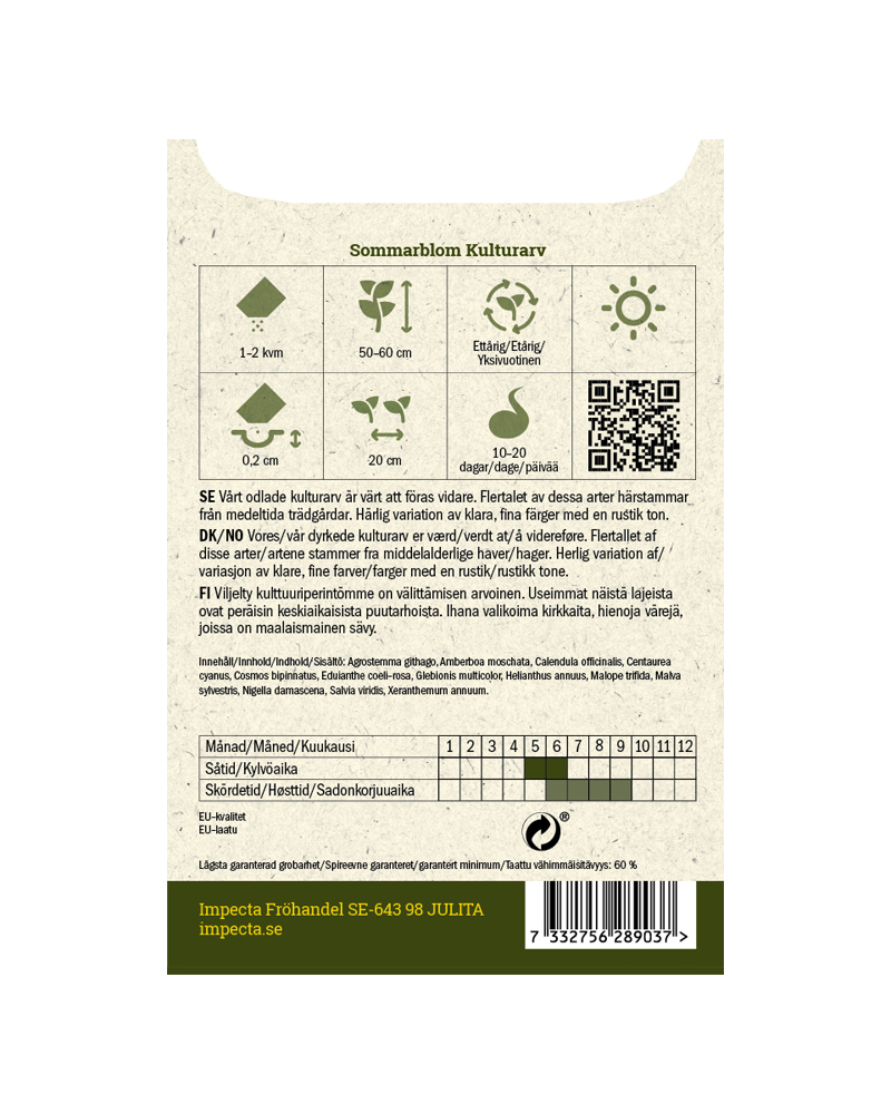 Plantekulturarven vår er verdt å videreføre. De fleste av disse artene stammer fra hager i middelalderen. Herlig variasjon av sterke, fine farger med et preg av rustikk.Innhold: Agrostemma githago, Amberboa moschata, Calendula officinalis, Centaurea cyanus, Cosmos bipinnatus, Eduianthe coeli-rosa, Glebionis multicolor, Helianthus annuus, Malope trifida, Malva sylvestris, Nigella damascena, Salvia viridis og Xeranthemum annuum.Dyrking fra frø:Sås direkte på friland når jorden er varm. Forbered jorden ved å grave og krafse den. Vann jorden godt før såing. Bland 1/4 frø med 3/4 sand, og strø posens innhold utover 1-2 m2. Dekkes med et tynt jordlag, og holdes fuktig gjennom spiringsperioden.