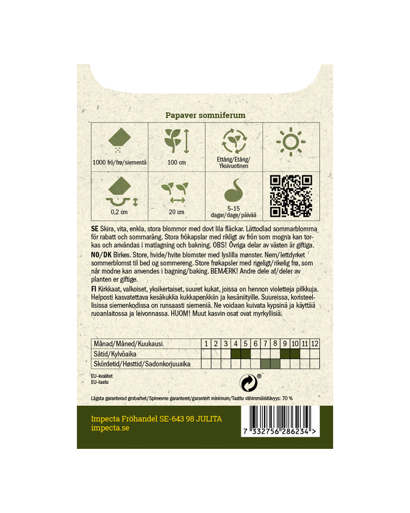Delikate, hvite, enkle, store blomster med svake flekker av lilla. Modne frø kan tørkes og brukes i matlaging og bakverk. Obs! De øvrige delene av planten er giftige. Dyrking fra frø: Sås direkte på vokseplassen når jorden har blitt varm. Vann jorden før såing, holdes fuktig gjennom spiringsperioden. Kan også sås på høsten for tidligere blomstring. Tynnes til 20 cm planteavstand. Selvsår seg lett.