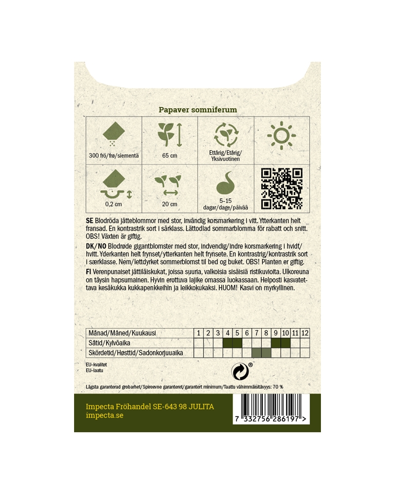 Blodrøde kjempeblomster med stor innvendig kryssmarkering i hvitt. Ytterkanten er helt frynset. Lettdyrket sommerblomst til blomsterbed og snittblomster. OBS! Planten er giftig. Dyrking fra frø: Sås direkte på vokseplassen når jorden har blitt varm. Vann jorden før såing, holdes fuktig gjennom spiringsperioden. Kan også sås på høsten for tidligere blomstring. Tynnes til 20 cm planteavstand. Selvsår seg lett.