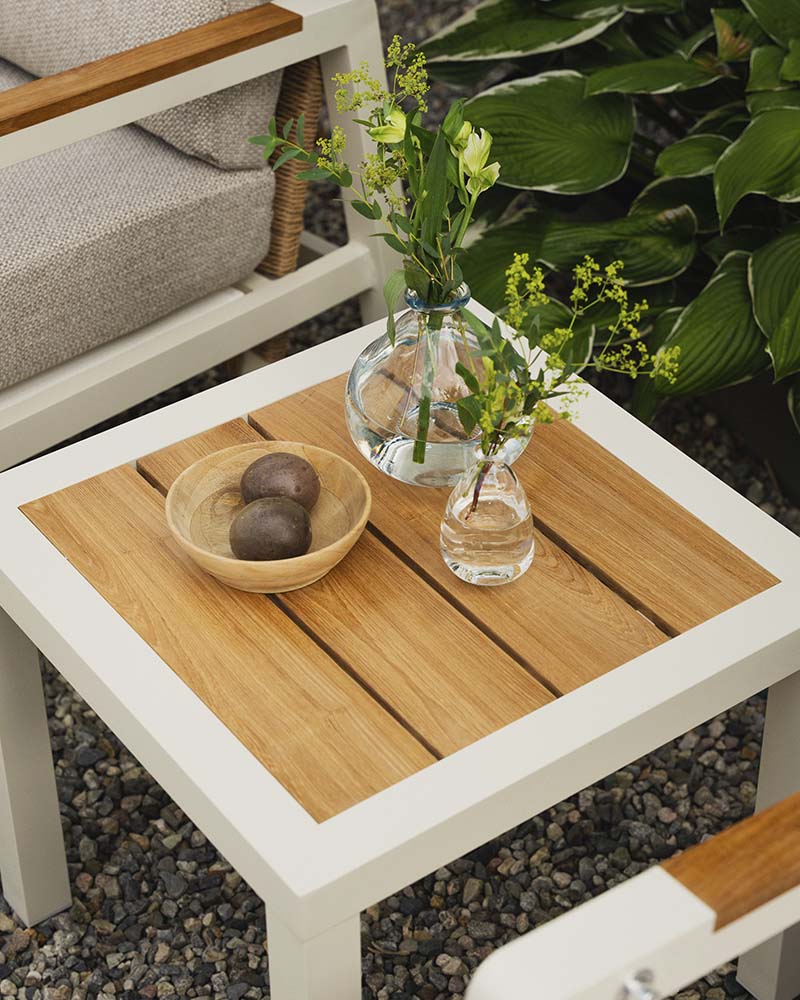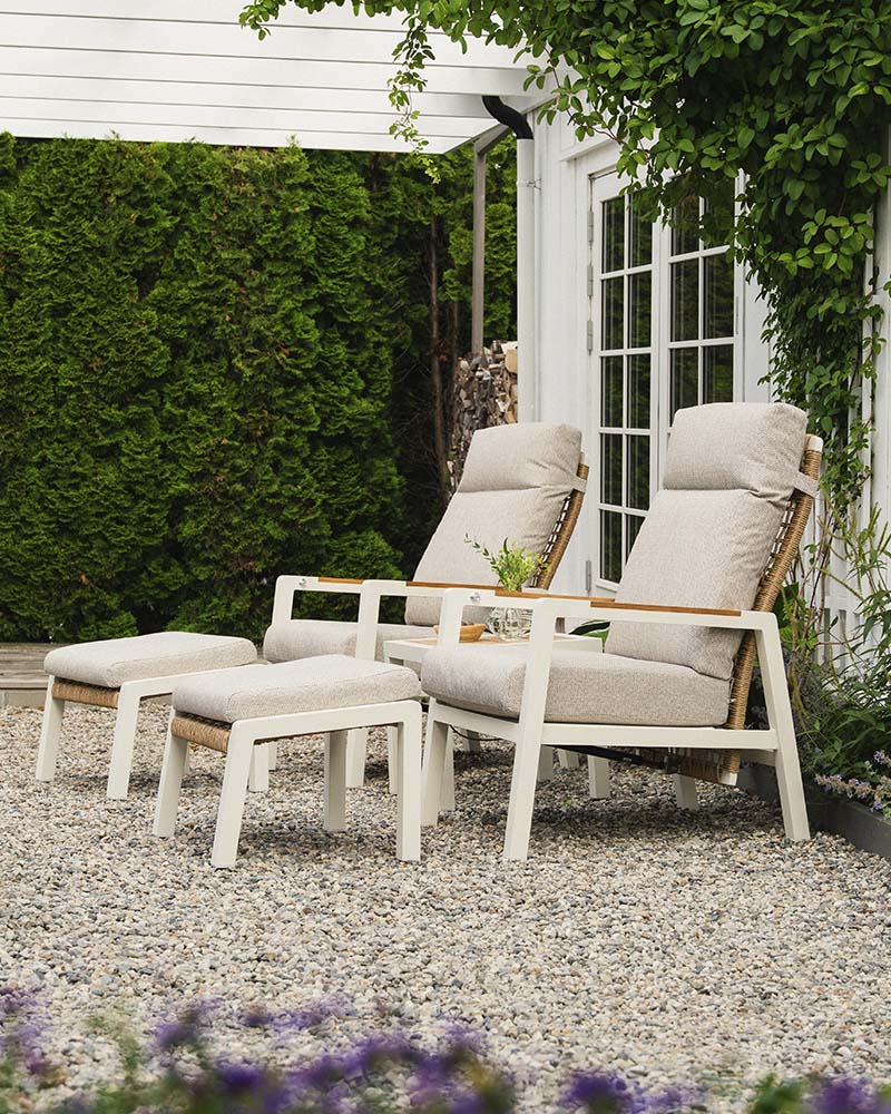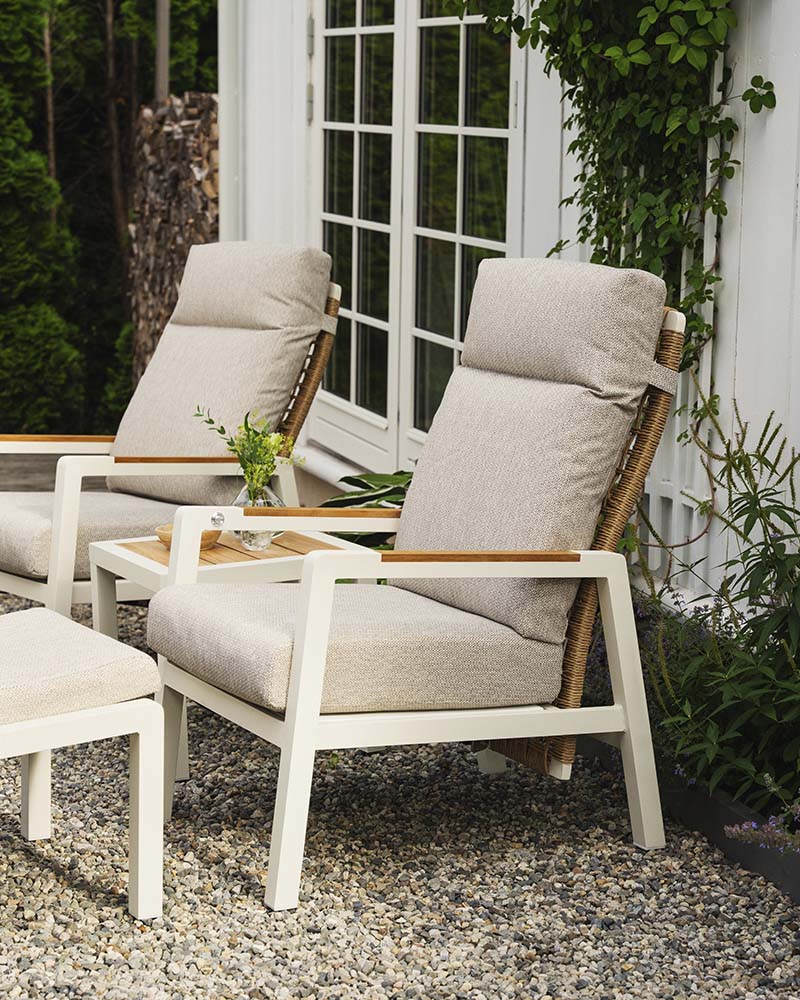 Linde reclinersett er et tidløs sett med svært god sittekomfort. Det er laget på en aluminiumsramme med lekker flett i kunstrotting i ryggen, og har teakdetaljer på armlener. Putene tåler en regnskur da de er i vannavvisende gjennomfarget polyester. Putene har i tillegg et lag TPU-liner på innsiden. De har textilene på undersiden som lar skummet i putene puste. Settet består av 2 stoler med regulering i ryggen, 2 fotpaller og et sidebord med teak bordplate. Stol: B66xD87xH103,5 Pall: B59xD51xH38,5 Sidebord: B50xD50xH45