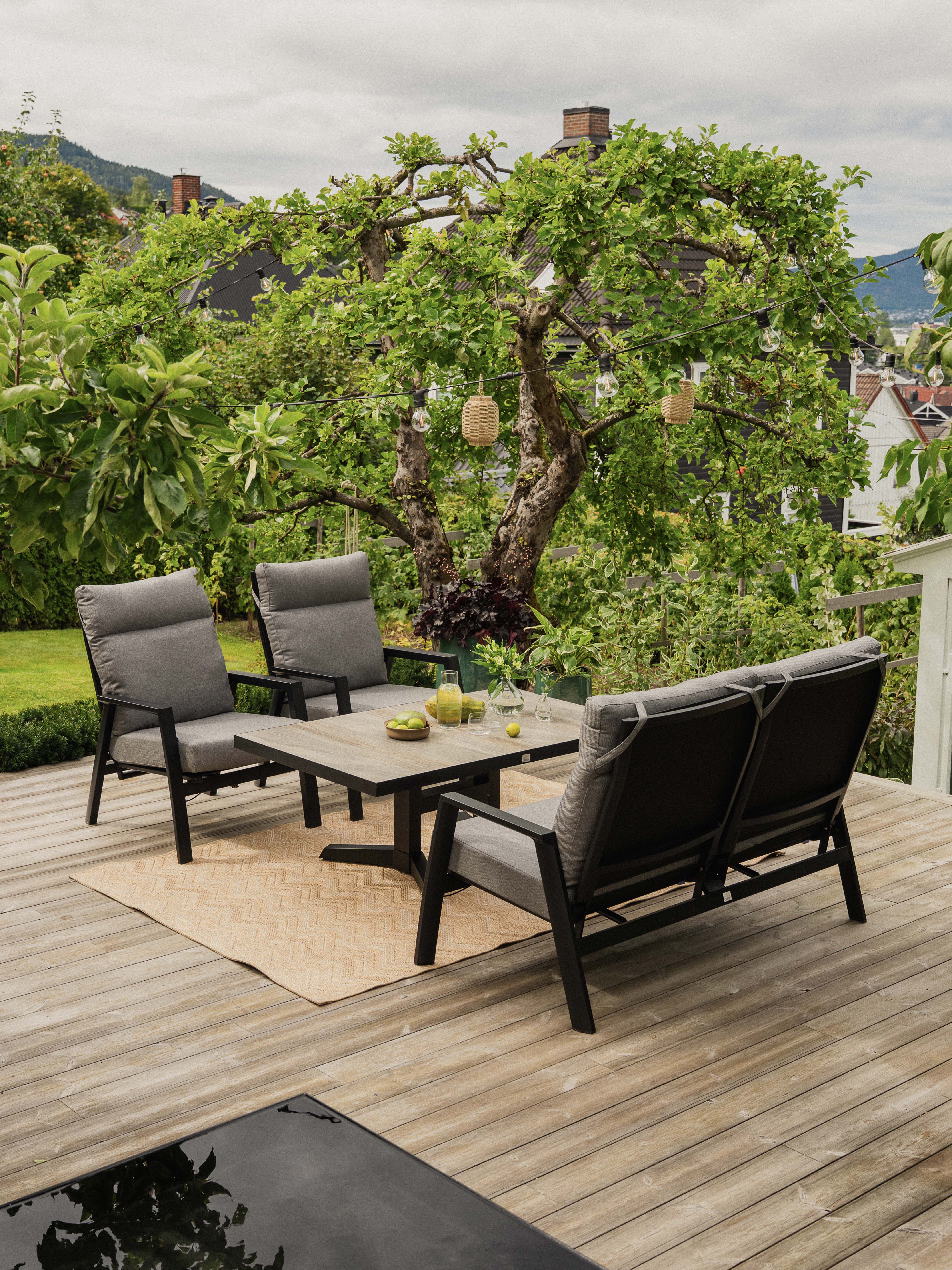 Flott og komfortabel 2-seter sofa i sort aluminium og med reclinerfunksjon. Dette betyr at ryggen kan legges bakover. Putene er i varm-grått olefinstoff. Dette er et svært fargesterkt materiale som absorberer lite vann. Vi anbefaler likevel at du legger putene under tak skulle det komme et regnskyll.