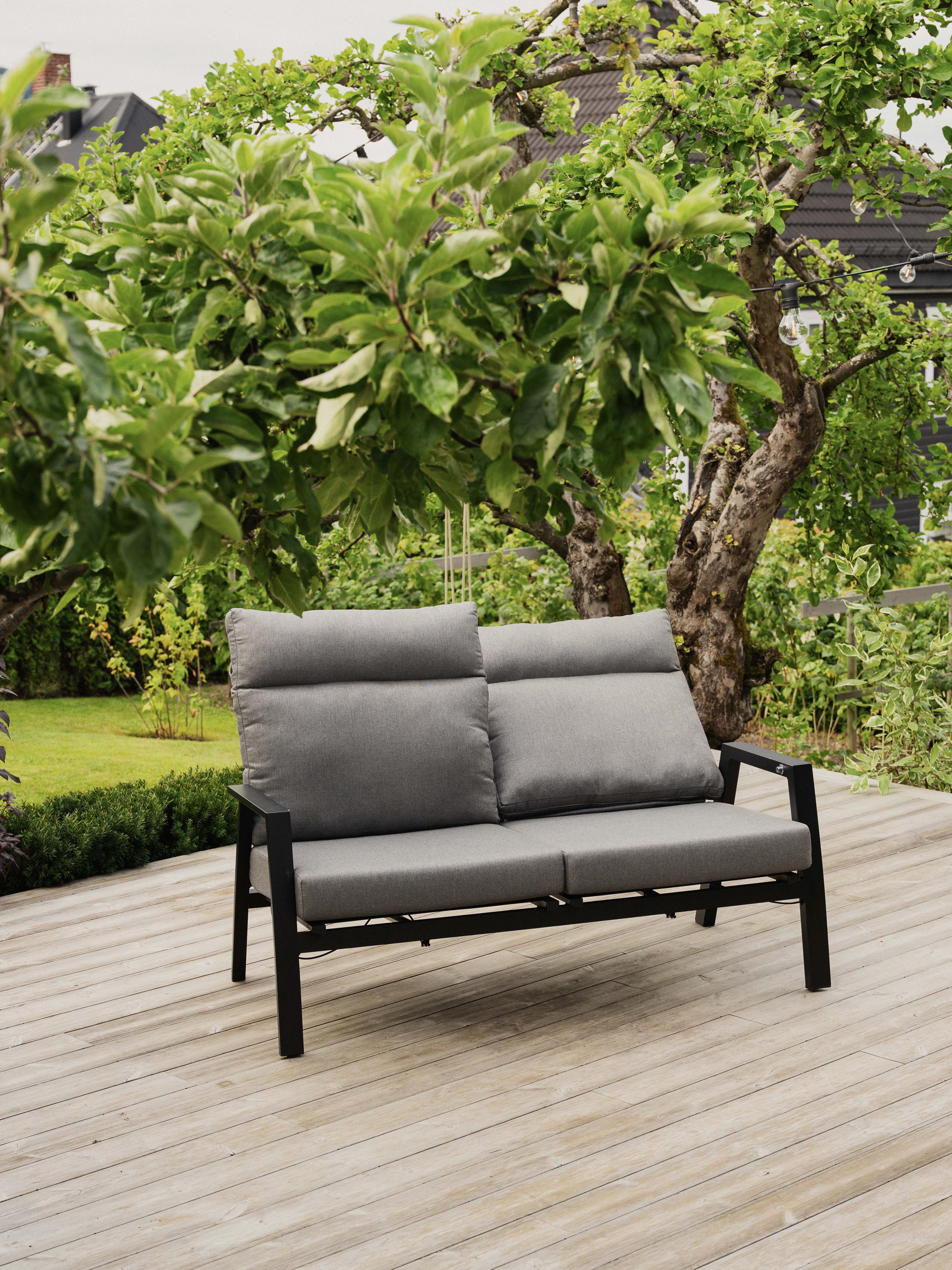 Flott og komfortabel sofagruppe i sort aluminium. Settet består av en 2-seter sofa og to lenestoler, alle med reclinerfunksjon. Dette betyr at ryggen kan legges bakover. Videre består gruppa av et justerbart bord som kan høydereguleres fra 49 til 71 cm. Putene er i varm-grått olefinstoff. Dette er et svært fargesterkt materiale som absorberer lite vann. Vi anbefaler likevel at du legger putene under tak skulle det komme et regnskyll. Keramisk bordplate. Husk å olje vaier og sylinder til høyderegulering vår og høst. Det kan forekomme små avvik fra bildet på nettsiden og produktet i butikk. Mål: 2-seter sofa B152xD81 cm H98 cm Stol B72xD81 cm H98 cm Hev/senk-bord 140x85 cm