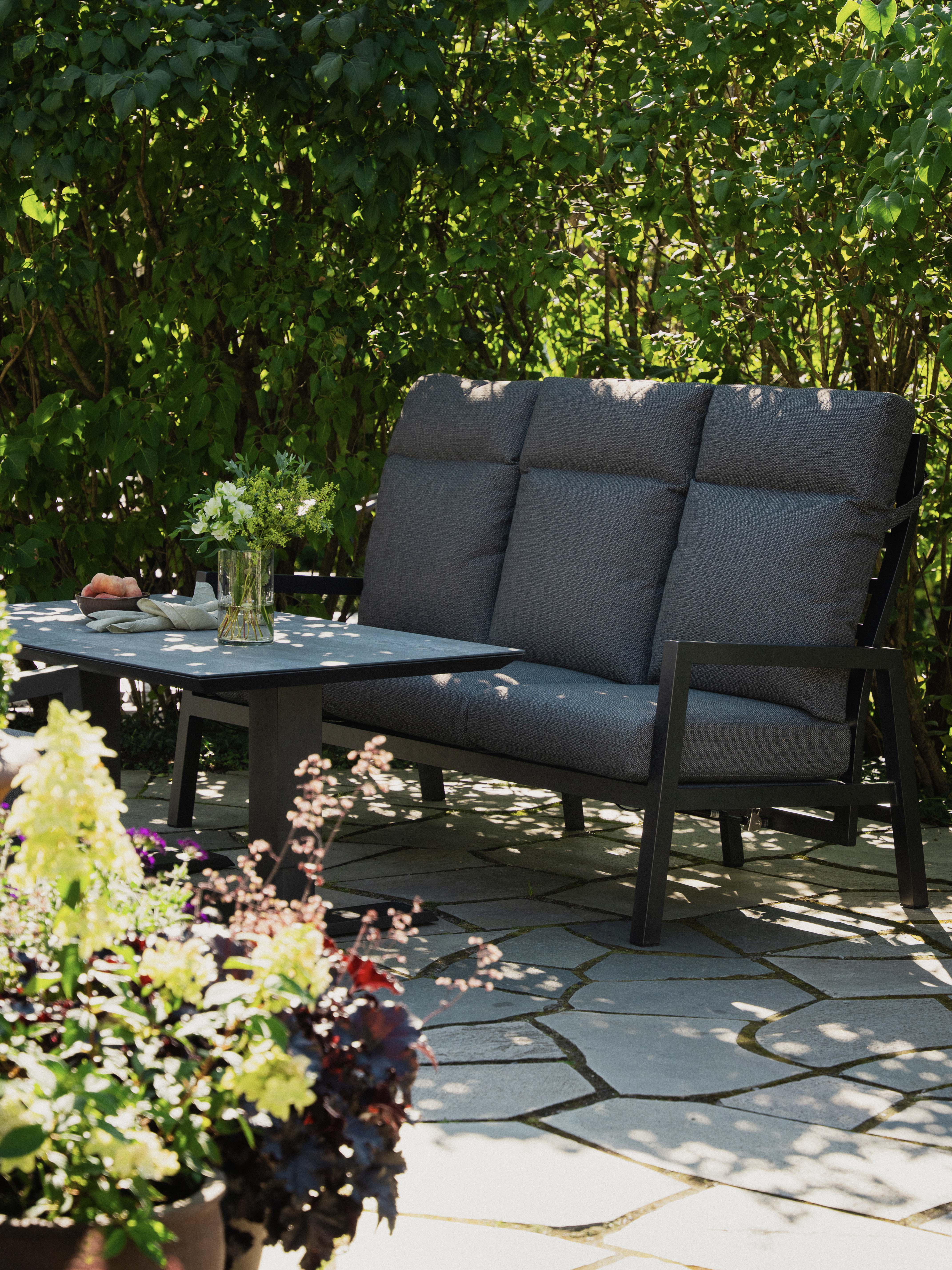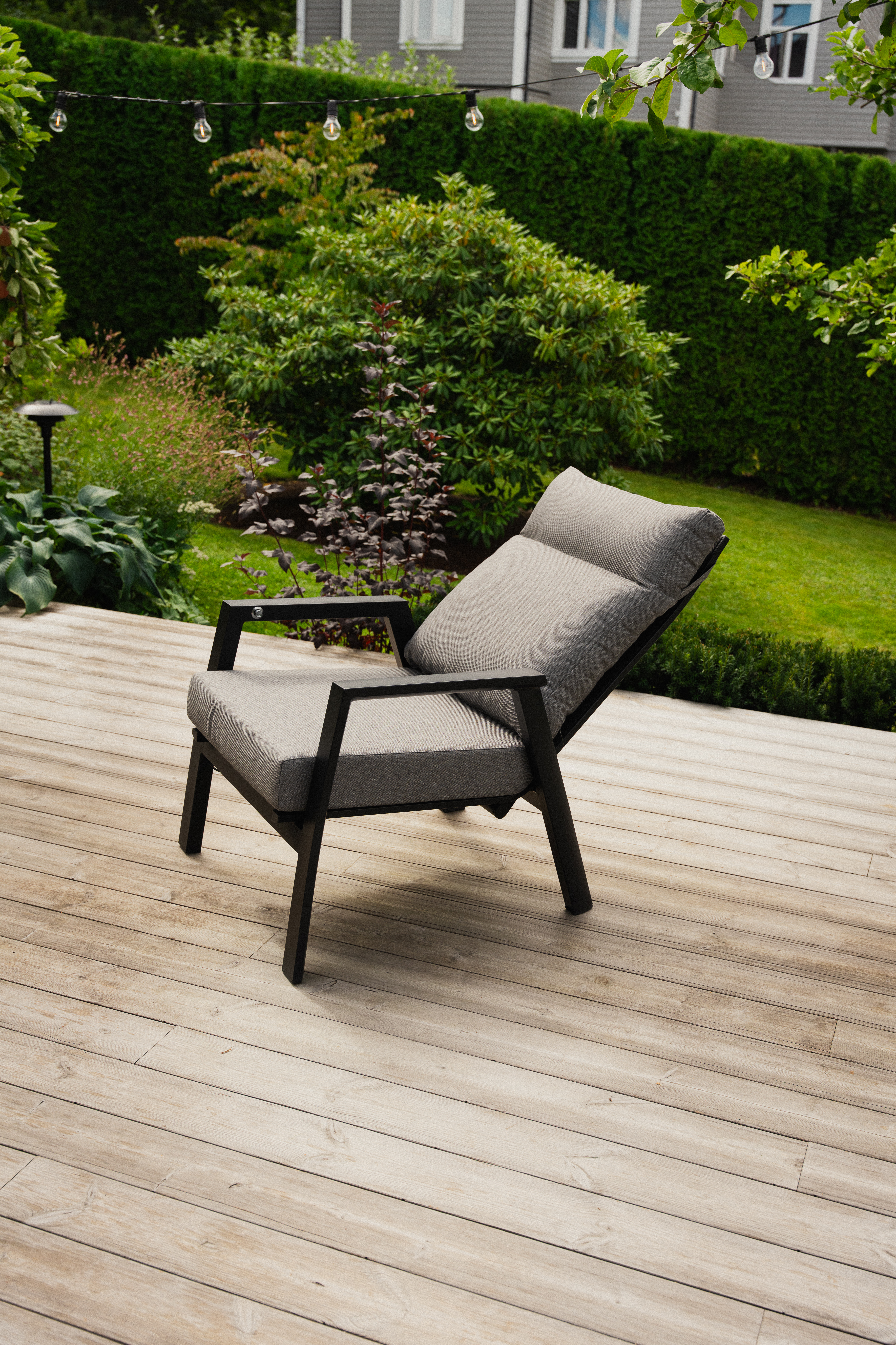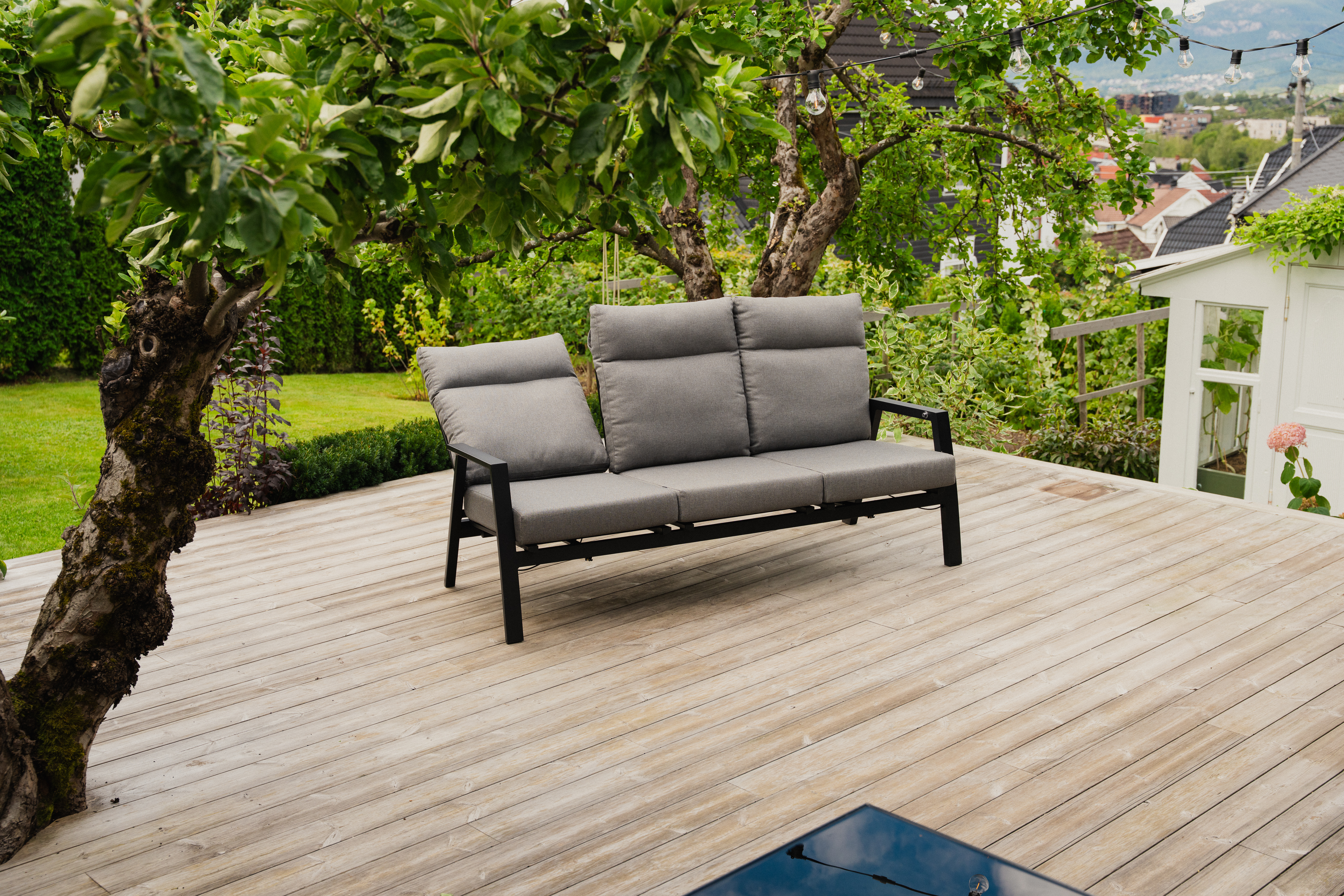 Flott og komfortabel sofagruppe i sort aluminium. Settet består av en 3-seter sofa, en 2-seter sofa og 1 lenestol, alle med reclinerfunksjon. Dette betyr at ryggen kan legges bakover. Videre består gruppa av et justerbart bord som kan høydereguleres fra 47 til 71 cm. Putene er i varm-grått olefinstoff. Dette er et svært fargesterkt materiale som absorberer lite vann. Vi anbefaler likevel at du legger putene under tak skulle det komme et regnskyll. Keramisk bordplate. Husk å olje vaier og sylinder til høyderegulering vår og høst. Det kan forekomme små avvik fra bildet på nettsiden og produktet i butikk. Mål: 3-seter sofa B192xD81 cm H98 cm 2-seter sofa B152xD81 cm H98 cm Stol B72xD81 cm H98 cm Hev/senk-bord 140x85 cm