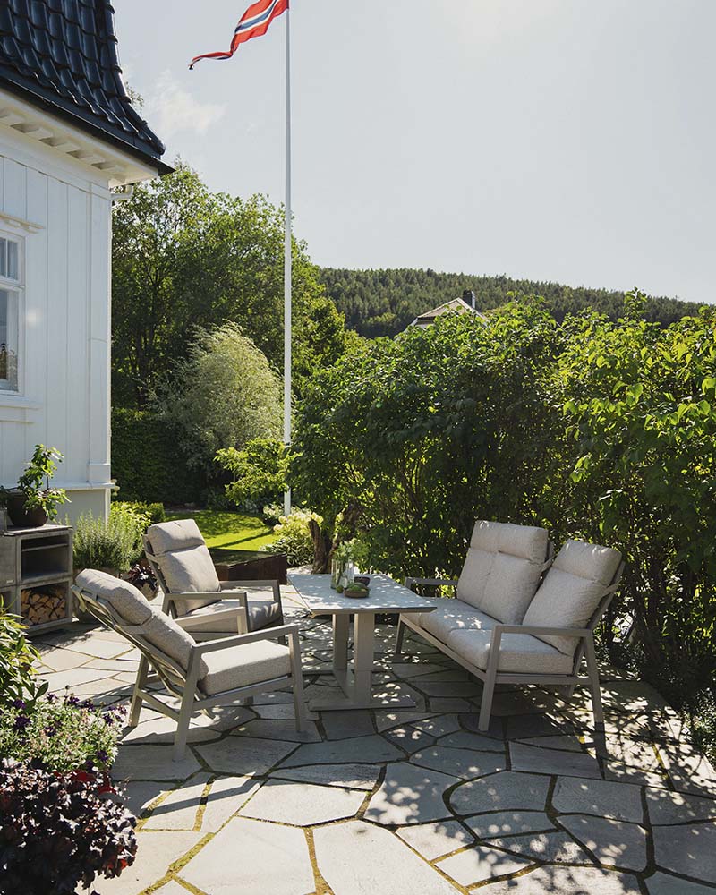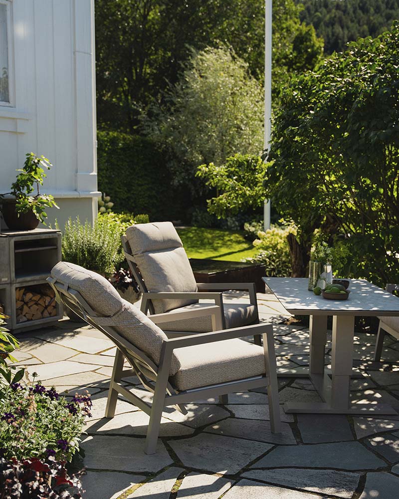 Skagen er en stilren, tidløs og flott serie med møbler. Stolen kan reguleres i ryggen, og har en høy sittekomfort. Putene er vannavstøtende, impregnert og UV-behandlet. De er laget av 350g solution-dyed polyester med TPU-liner. Dette gjør at de tåler en skikkelig regnskur uten at puten blir våt inni.