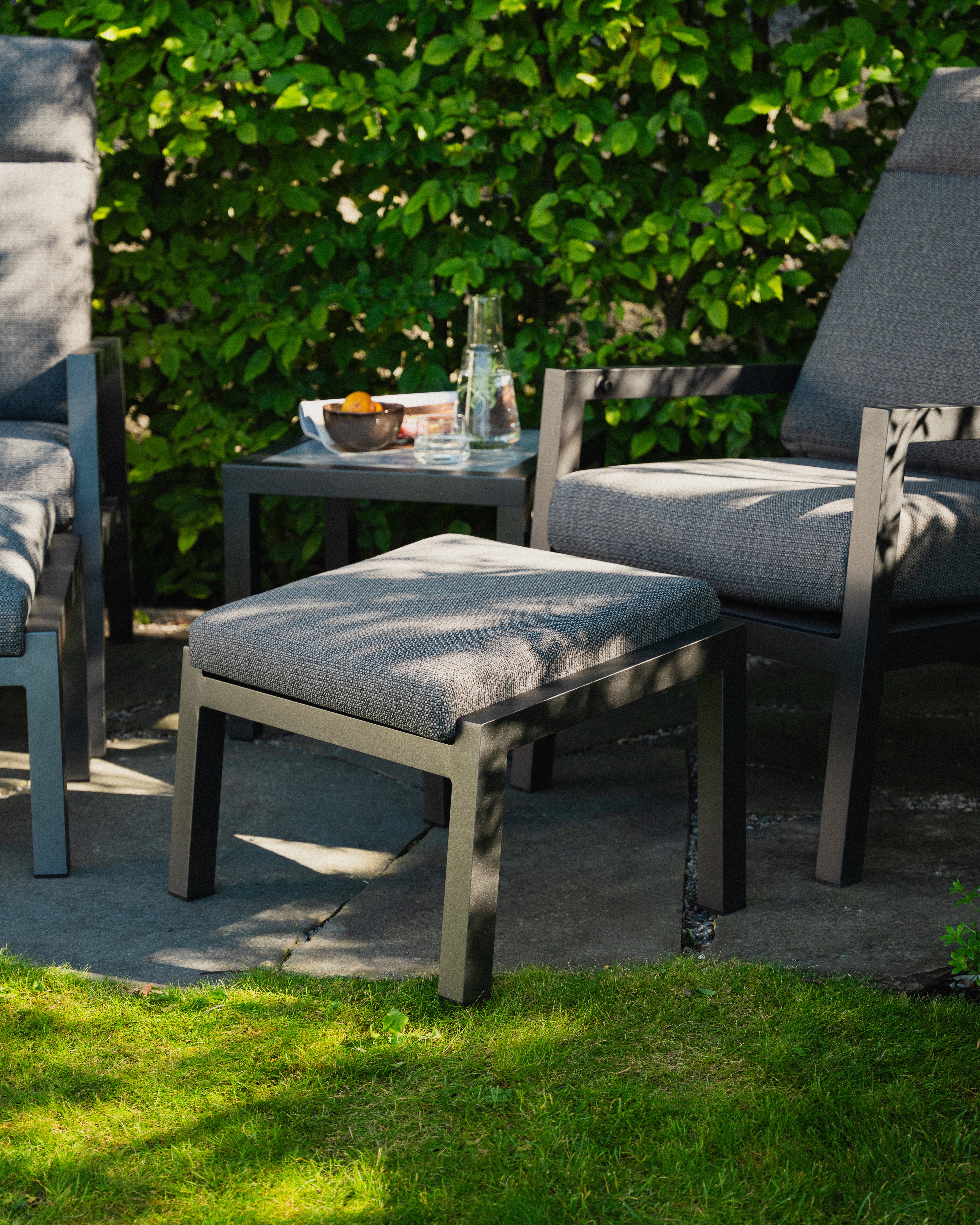 Skagen er en stilren, tidløs og flott serie med møbler. Reclinersettet består av 5 deler, to stoler, to fotpaller og et sidebord. Stolene kan reguleres i ryggen, og har en høy sittekomfort. Putene er vannavstøtende, impregnert og UV-behandlet. De er laget av 350g solution-dyed polyester med TPU-liner. Dette gjør at de tåler en skikkelig regnskur uten at puten blir våt inni. Stol: B66xD87xH103,5 Pall: B59xD51xH38,5 Sidebord: B50xD50xH45