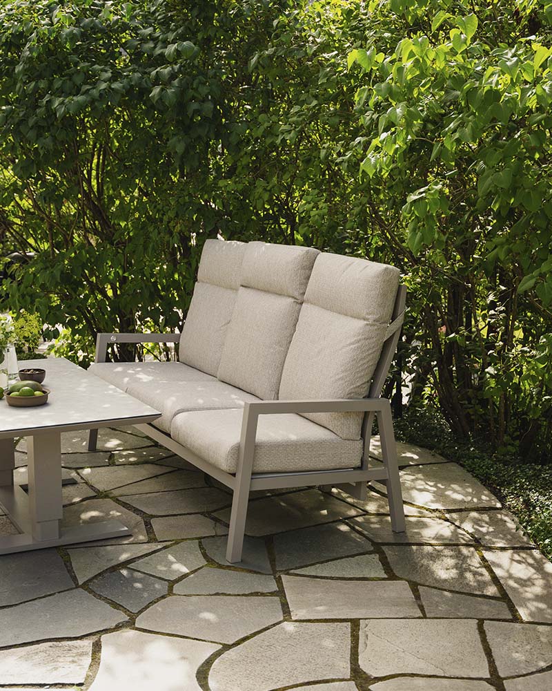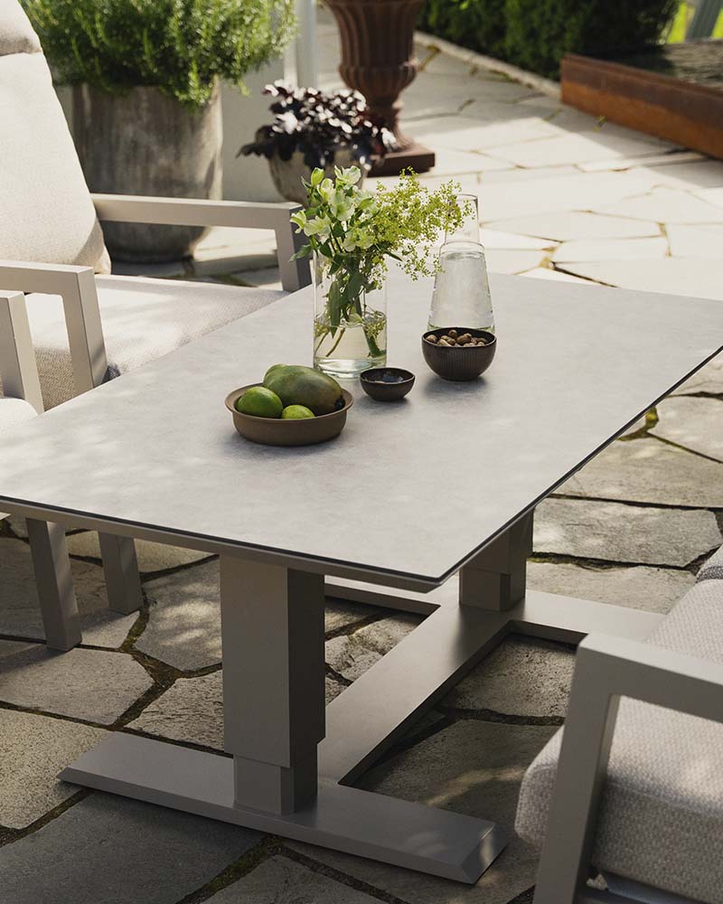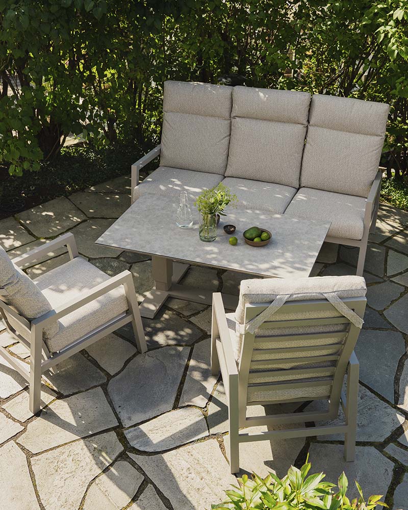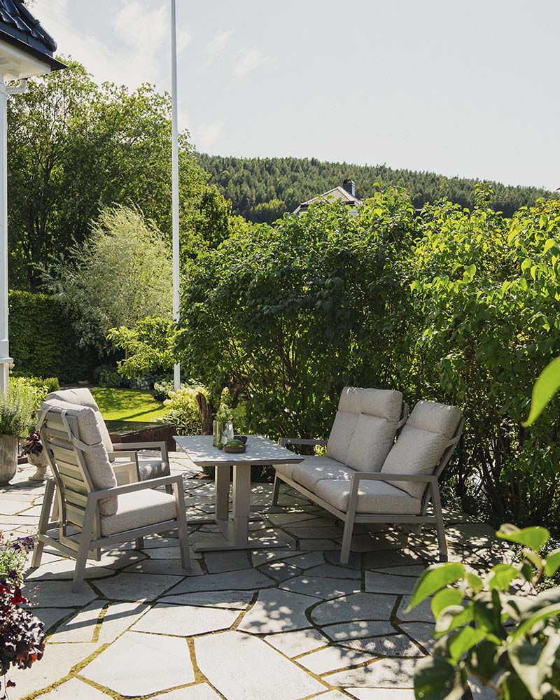 Skagen sofagruppe har høy sittekomfort. Sofaen har 3 seter, og ryggen kan reguleres på høyre og venstre setepute. De to reclinerstolene i settet kan og reguleres i ryggen. Skagen er en stilren, tidløs og flott serie med møbler. Putene er vannavstøtende, impregnert og UV-behandlet. De er laget av 350g solution-dyed polyester med TPU-liner. Dette gjør at de tåler en skikkelig regnskur uten at puten blir våt inni. Settet inneholder også skagen hev/senk bord, som er et praktisk bord, som gjør at gruppen din kan brukes både til spising og avslapning. Det kan heves fra 51 cm til 69 cm. Det er laget på et pulverlakkert aluminiumsramme med keramisk maskinprint på herdet glass. 3 seter: B188xD84xH103,5 Stol: B66xD87xH103,5 Bord: B140xD80xH51/69