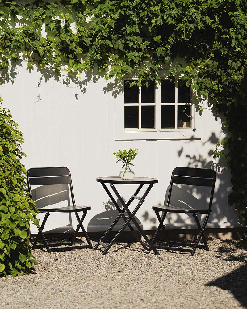 Toledo er et stilrent og flott cafesett i pulverlakkert aluminium, forsterket med galvanisert stål på utsatte områder. Cafesettet er vedlikeholdsfritt, sammenleggbart og lett å flytte på. Det kommer i to farger, svart og taupe. Perfekt på en liten balkong, i hagekroken eller ved inngangspartiet. Bord: H:72,5 x D:60 cm Stol: H:83 x B:56 x D:50 cm