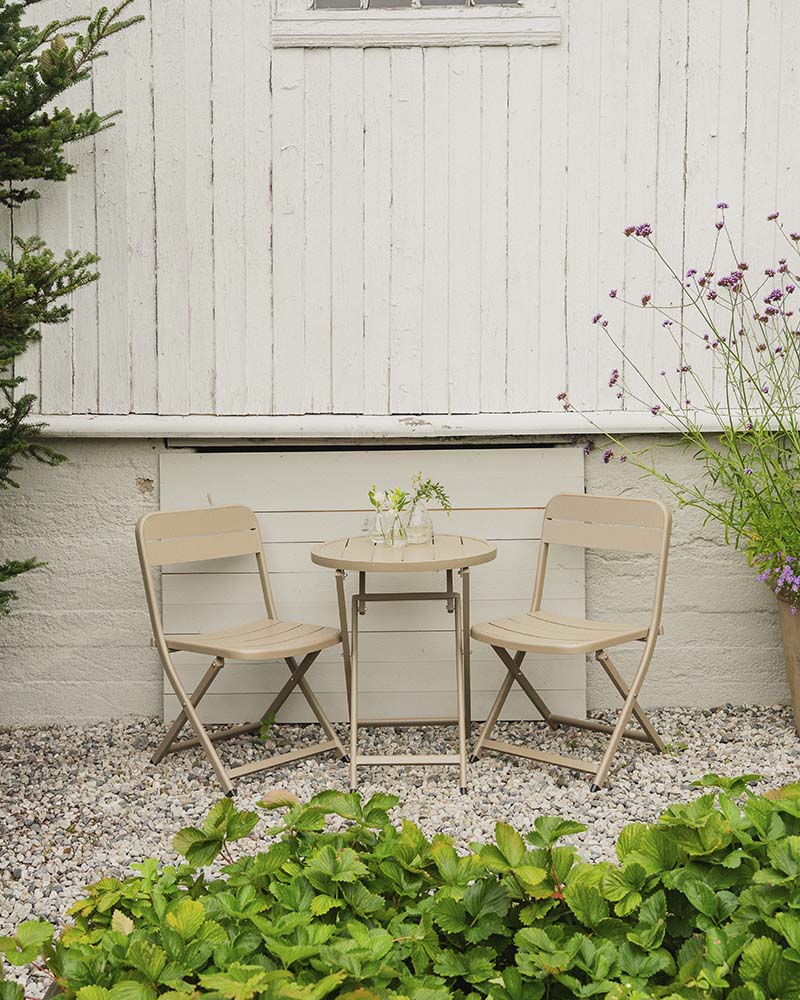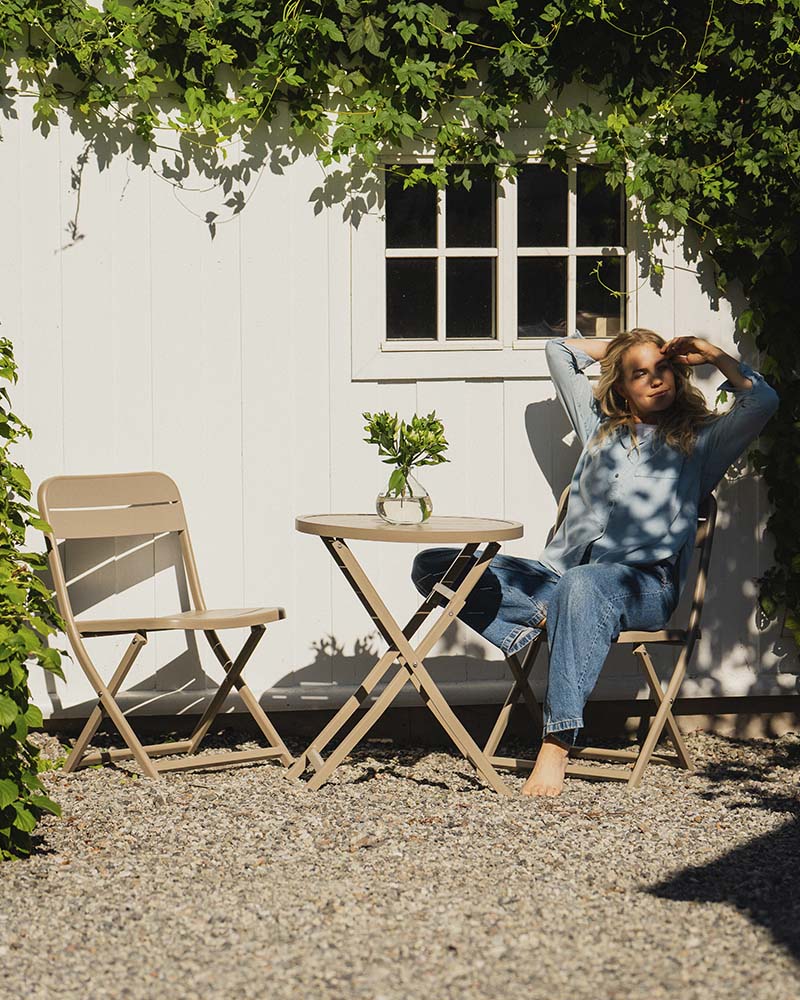 Toledo er et stilrent og flott cafesett i pulverlakkert aluminium, forsterket med galvanisert stål på utsatte områder. Cafesettet er vedlikeholdsfritt, sammenleggbart og lett å flytte på. Det kommer i to farger, svart og taupe. Perfekt på en liten balkong, i hagekroken eller ved inngangspartiet. Bord: H:72,5 x D:60 cm Stol: H:83 x B:56 x D:50 cm