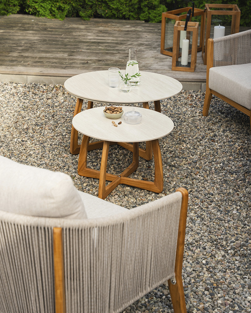 Viborg sofagruppe er en flott sofagruppe som er laget av teak og olefin rep, materialer som gir et lunt og naturlig uttrykk. Settet består av en 3-seter sofa og 2 stoler. Putene er laget av olefin. Mål: Sofa B206 D82 H90 Stol: B82 D82 H90. Bordsettet består av 2 bord, med diameter på 80 og 60 cm. Høyde 44 og 42 cm.