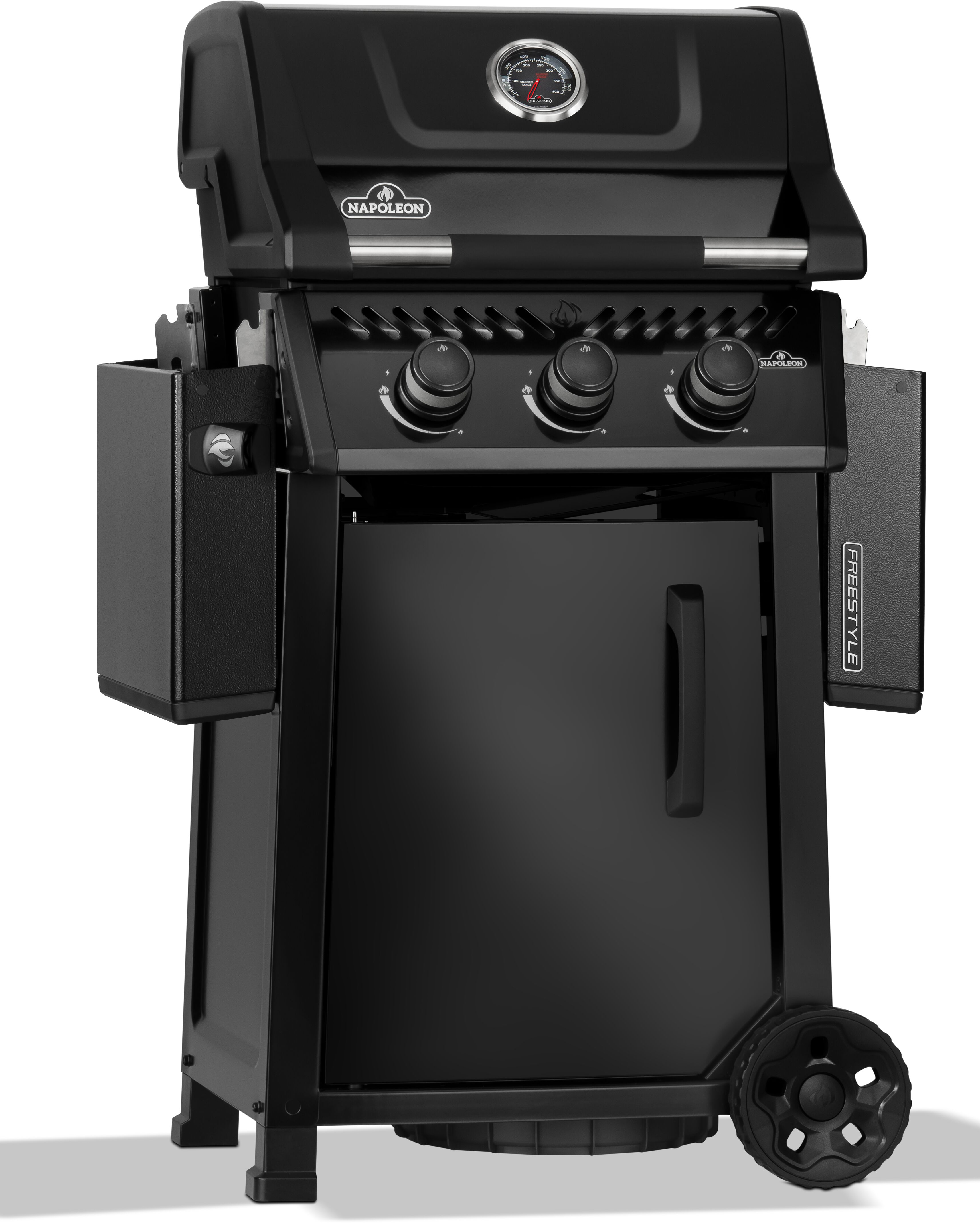 Napoleon Freestyle™ 365 er en kompakt gassgrill med førsteklasses funksjoner som gir maksimal verdi for pengene. Grillen er en av de minste i Napoleons sortiment, men du er garantert kanonbra ytelse slik at selv erfarne grillmestre kan diske opp med sine beste spesialiteter på en Napoleon Freestyle™ 365. Grillen er utstyrt med Napoleons pålitelige JETFIRE™-tenningssystem som tenner hovedbrennerne umiddelbart ved hjelp av en flammestråle. De emaljerte støpejerns ristene er utviklet for å absorbere maksimalt med varme, slik at du får de rette stekestripene på kjøttet. Varmen i grillen styres av de tre hovedbrennerne i holdbart, rustfritt stål, og du kan overvåke temperaturen ved hjelp av det innebygde termometeret i lokket. Med de to store hjulene er det lett å flytte grillen dit du vil ha den, og de to nedfellbare sidebordene med redskapskroker gjør det enkelt å tilpasse Freestyle™ etter behov og plass.