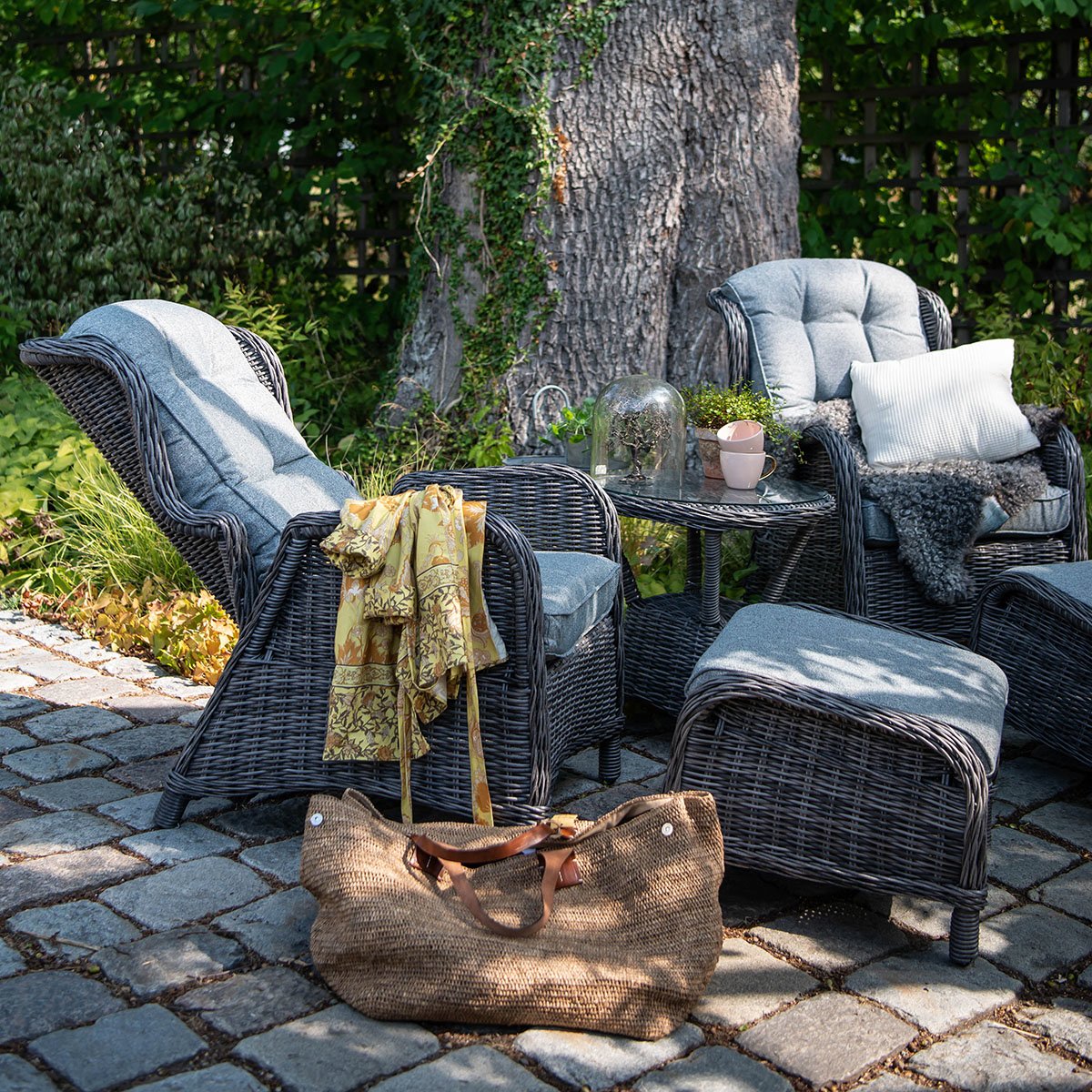 Fotpall med aluminiumsramme og mørk grå halvrund/rund kunstrotting. Kommer med gråmelert pute laget i gjennomfarget polyester. Dette er et materiale som tåler sollys meget godt og som er svært slitesterkt og trekker til seg lite vann. Vi anbefaler likevel at putene legges under tak når det regner.