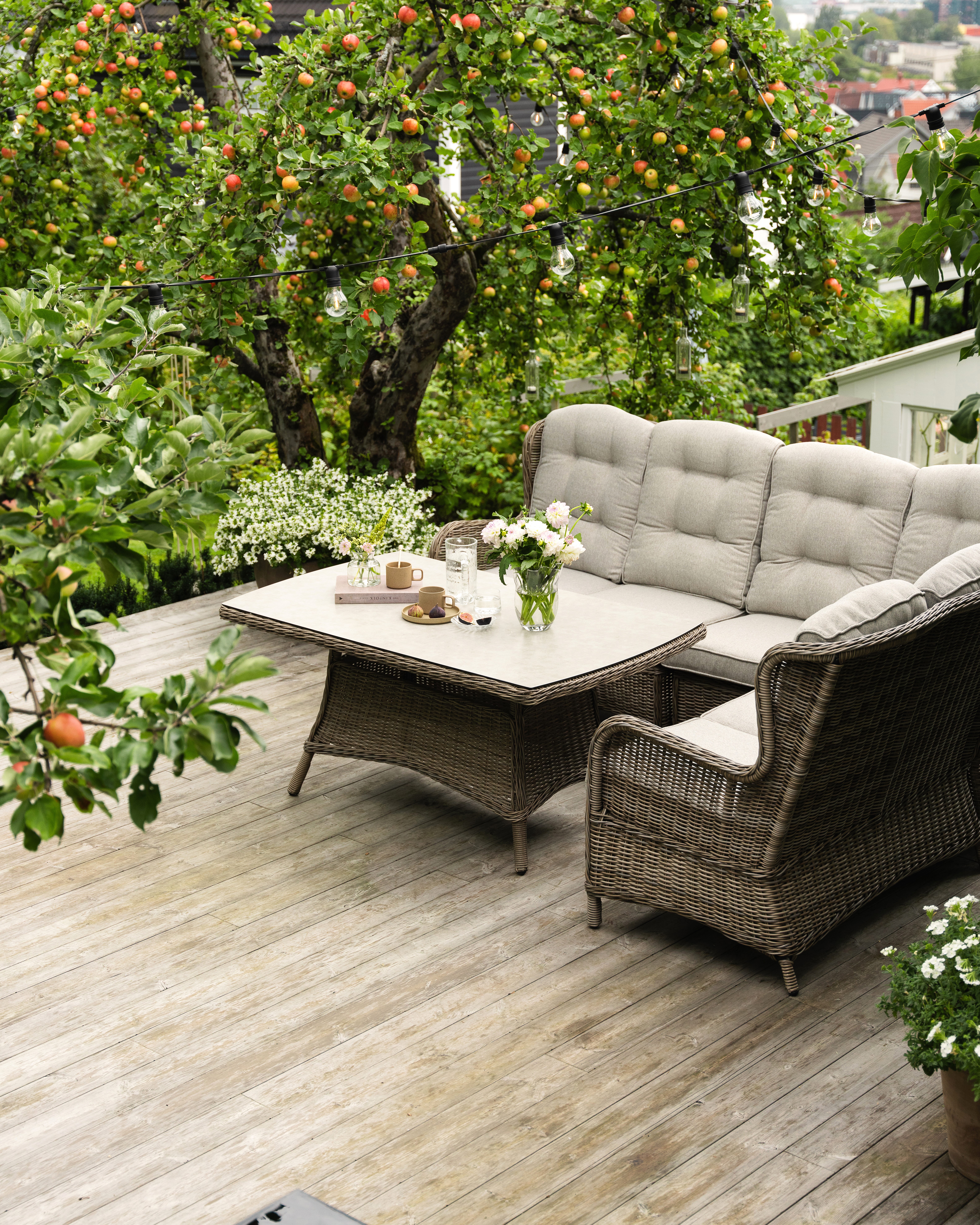 Sofabord med naturfarget halvrund/rund kunstrotting og glassplate. Det kan variere fra Hagesenter til Hagesenter om bordet leveres med klar eller printet glassplate.