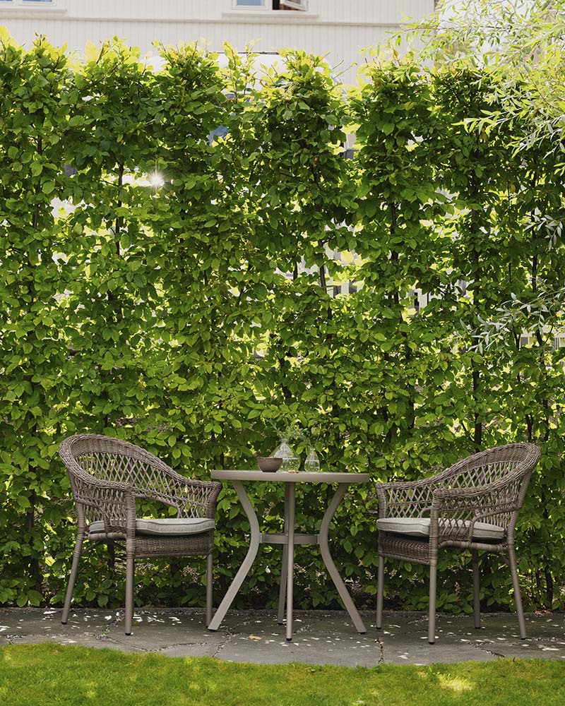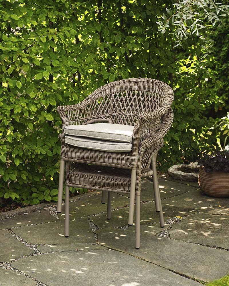 Thelma er et nett og fint cafesett, med to stoler som kan stables. Kommer med en god sittepute av impregnert og UV-behandlet solution-dyed polyester i linfarge. Mål: Bord 70x70 cm H72 cm Stol L66xD62 cm H86 cm