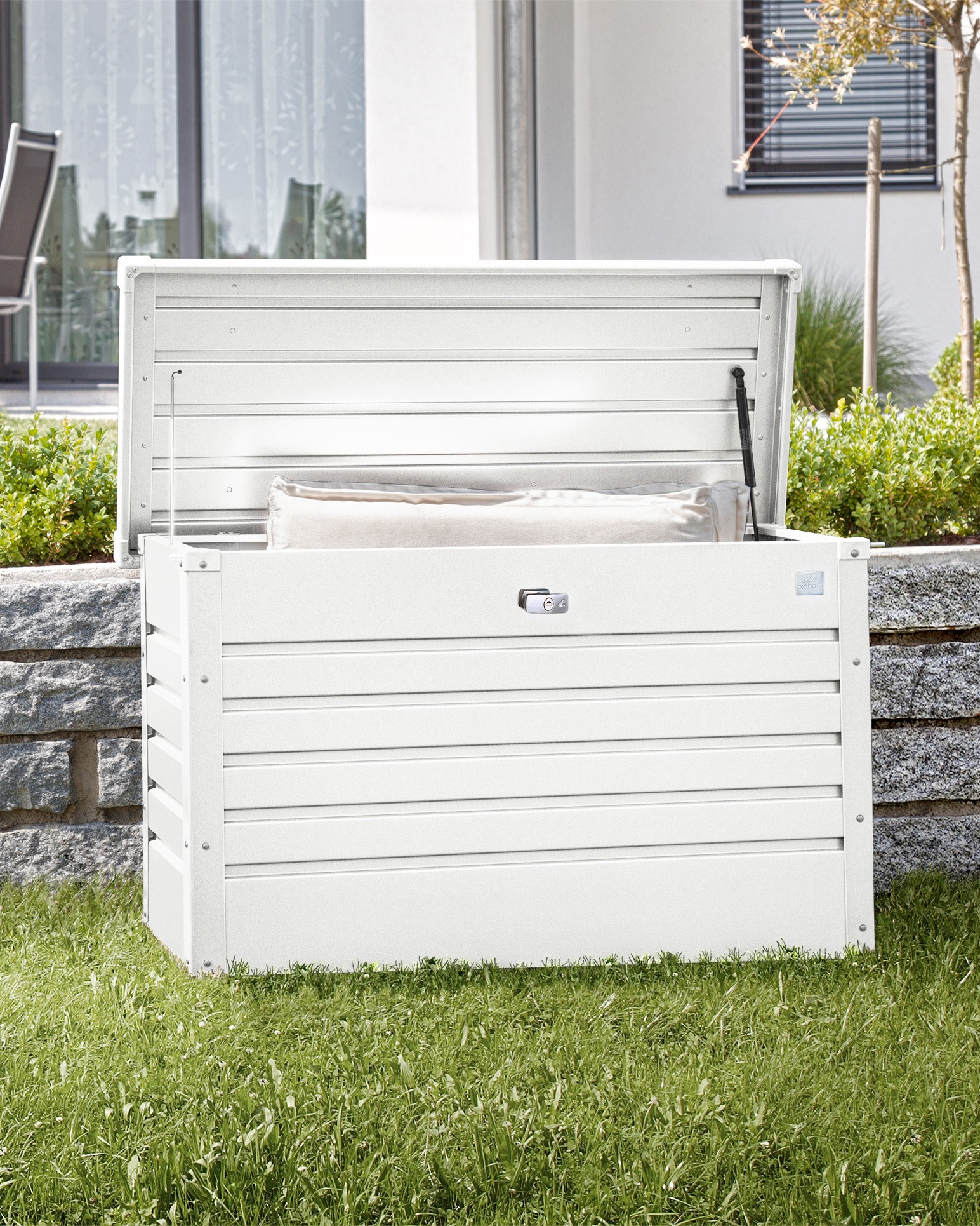 Praktisk oppbevaringsboks til utendørs bruk. Ideel til oppbevaring av hageputer, strandstoler, leker og sports- og campingutstyr. Regntett design med usynlig, integrert gjennomlufting. Kan låses ved hjelp av hengelås (ikke inkludert). Lokket åpnes og lukkes enkelt med en gasstrykkfjær. Biohort bruker varmgalvaniserte stålplater med en ekstra varmebehandling, og med polyamid på sine produkter. Bruken av materialer av topp kvalitet, gjør at Biohort trygt kan gi 20 års garanti mot korrusjon. Finnes i flere størrelser. Enkelte Hageland-avdelinger har disse produktene på lager, og varen kan da hentes der. Ordren sendes i de fleste tilfeller fra eksternt lager. Om ordren leveres direkte fra leverandør, kan den spores gjennom deres distributør. Disse ordrene settes i bestilling etter forhåndsbetaling til valgt butikk.