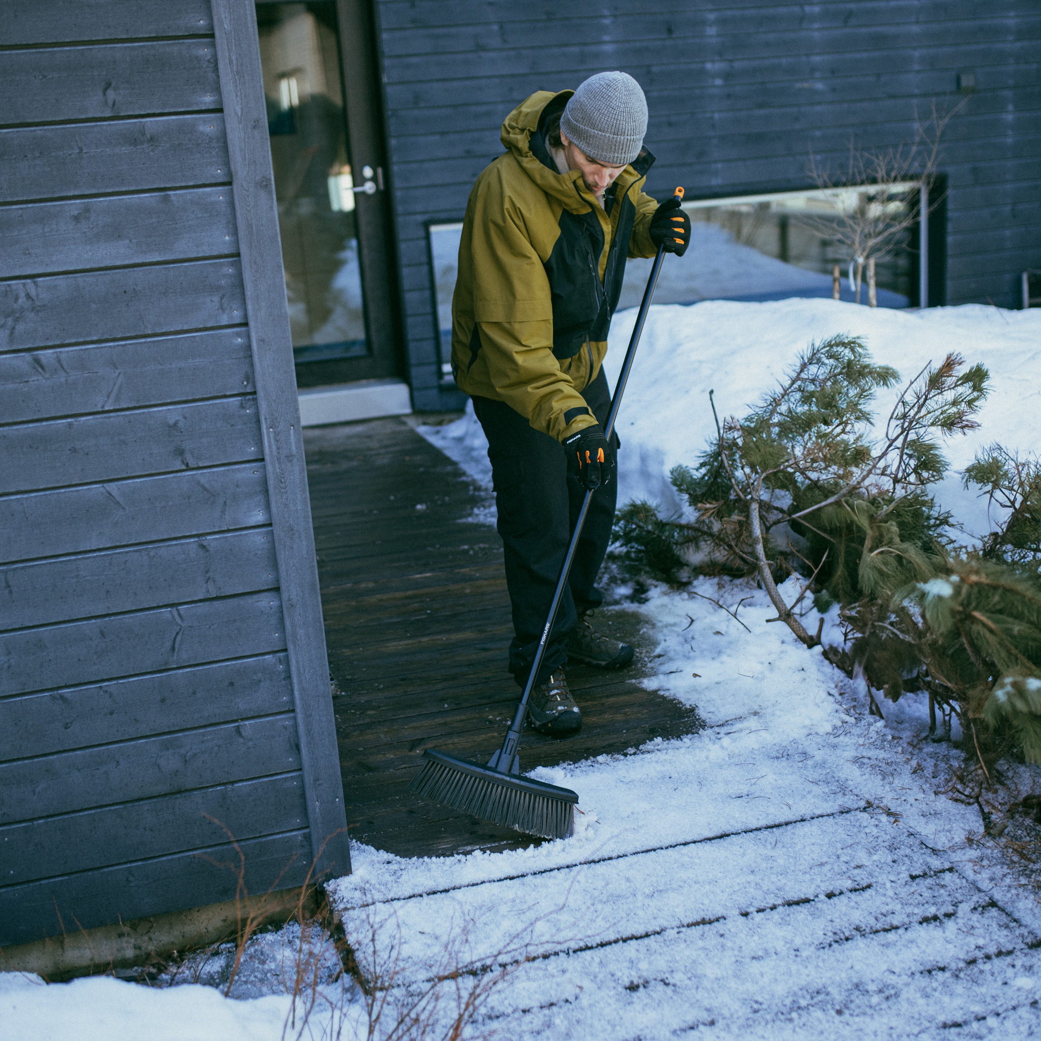 Universalkost for rengjøring på terrassen, oppkjørselen og hageområder. Kostens hode er svakt buet slik at den enklere samler opp avfall.