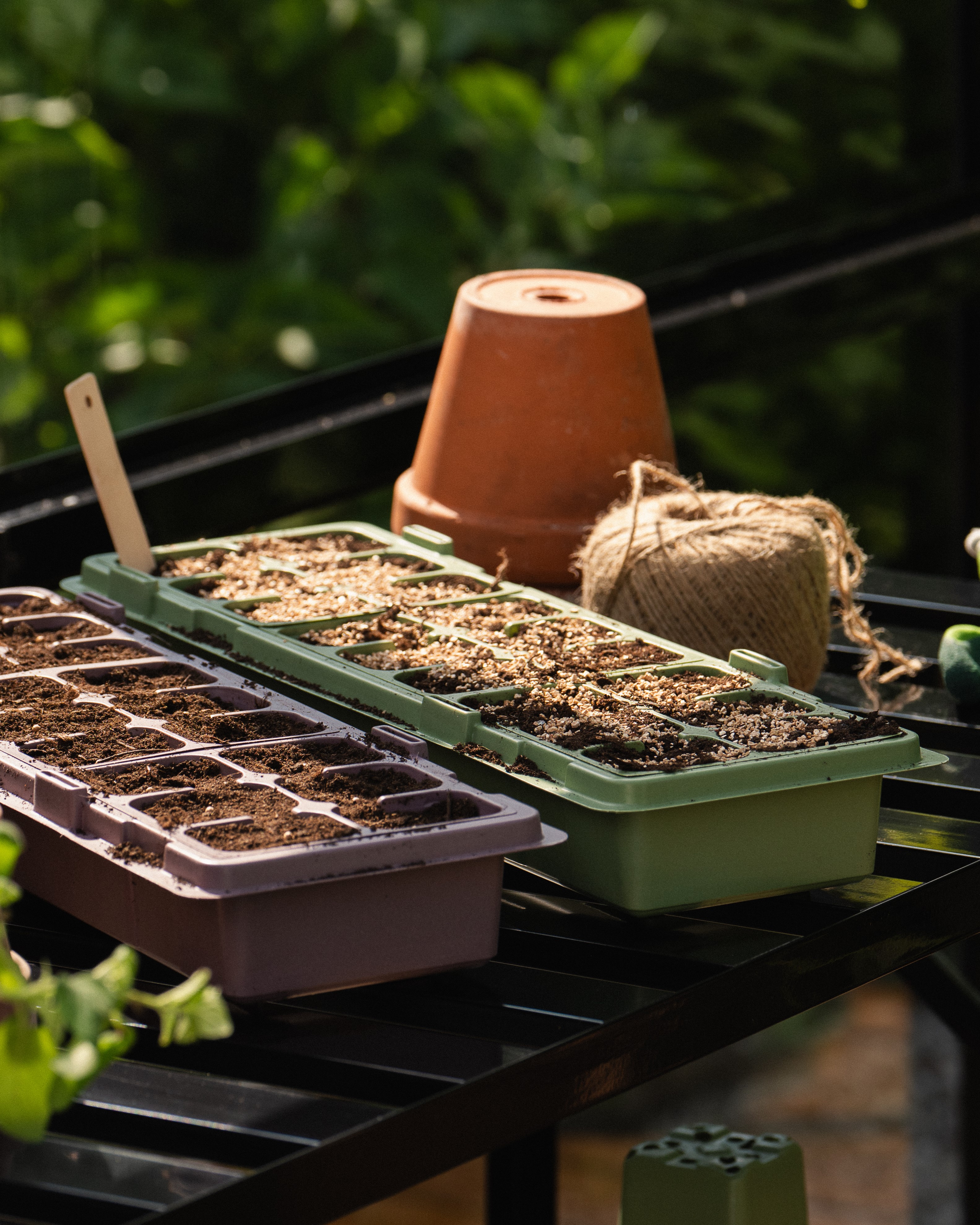 Drivhus for forkultivering av av blomster, urter og grønnsaker. 2 stk minidrivhus som passer perfekt i vinduskarmen. Transparente, vendbare lokk holder plantene varme og fuktige, samtidig som de slipper inn lys for å fremme vekst. Med 18 potter i hvert drivhus.