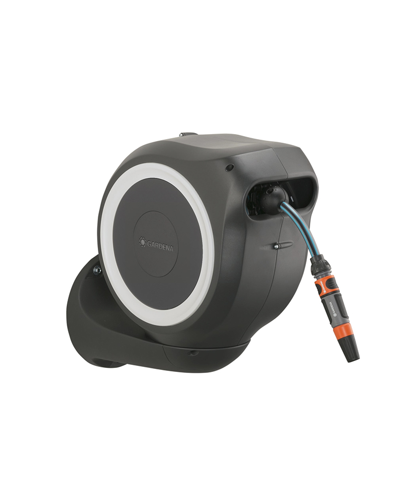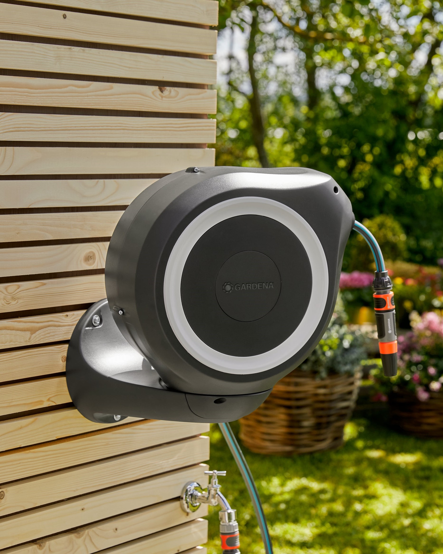 Veggslangeboks for enkel og fleksibel vanning av mindre hager. Monteres rett på husveggen og kobles til vannkranen med en forbindelsesslange (medfølger).