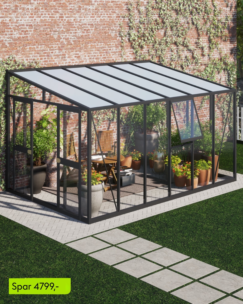 Helena drivhus 10,2 m2 er et romslig veggdrivhus som kan benyttes både som veksthus og vinterhage. Huset har solide, høye og elegante, elokserte aluminiumsprofiler. Veggene leveres med 3 mm herdet glass og taket har 10 mm polykarbonatplater. Polykarbonat i taket reduserer kondens og varmetap. Drivhus Helena har doble skyvedører med lås, og kan plasseres i husets front eller på en av kortsidene. Det medfølger to topphengslede vinduer som monteres på en av kortsidene, avhengig av dørplassering. Leveres med solid bunnsvill og krever derfor ikke egen sokkel. Sidehøyde 187 cm/totalhøyde 239 cm. Lengde 397 cm og bredde 266 cm.