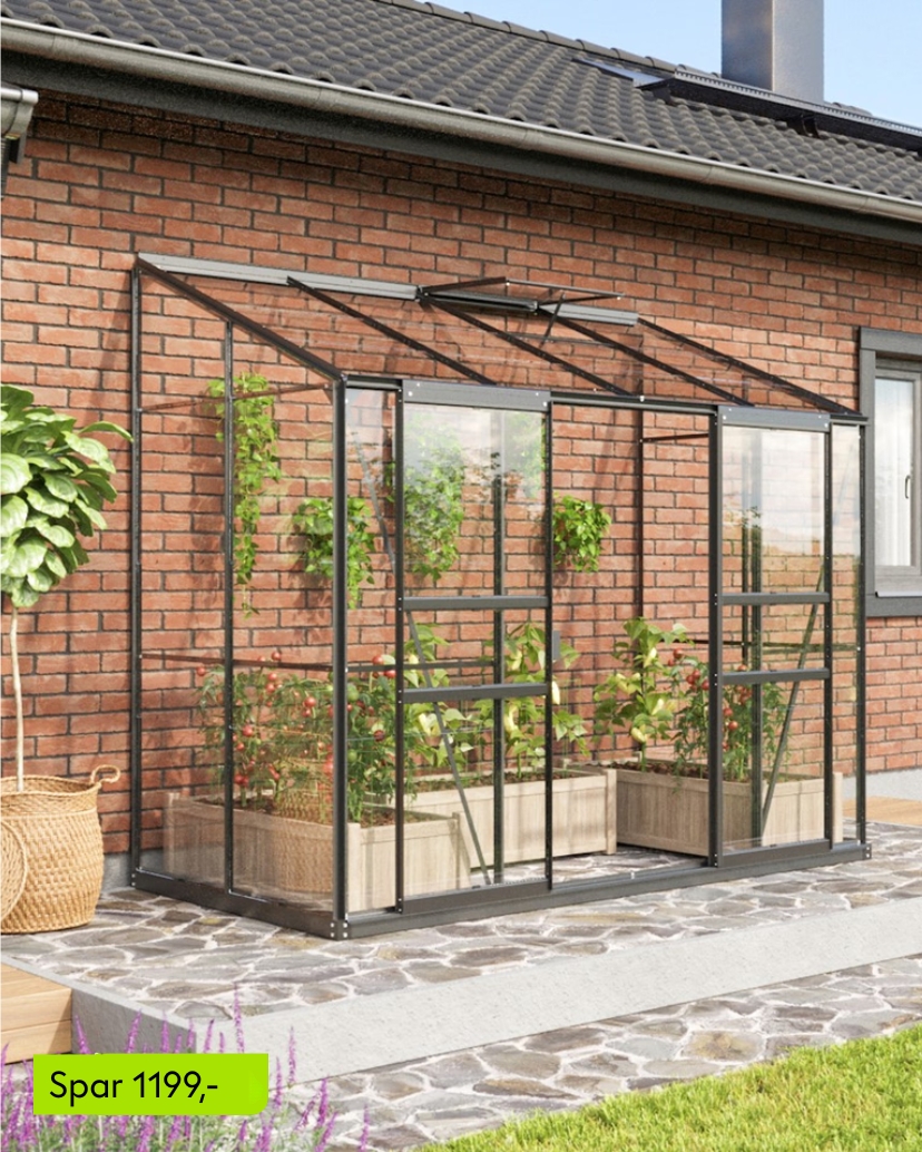 Ida drivhus 3,3 m2 m/glass er perfekt for hobbygartnere som har begrenset plass. Ida er designet for bruk på balkonger, terrasser eller i hager. Disse modellene er ideelle for å dyrke sommerblomster og grønnsaker som tomater, agurker og krydderplanter. Alle modellene har takluke og en høy skyvedør for å sikre enkel tilgang. Drivhuset har takluke og leveres med aluminiums-profiler som holder glasset i 3 mm tykkelse på plass. Sokkel for å få løftet huset kan bestilles i tillegg. Totalhøyde 222 cm. Lengde 257 cm og dybde 130 cm.