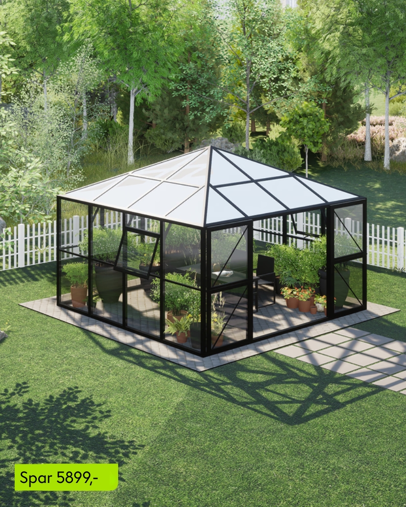 Hageland drivhus/utestue 17,2 m2 er et romslig pulverlakkert kvalitetsdrivhus med kraftige profiler, designet for den lidenskapelige hobbygartneren. Kan fint benyttes både som drivhus og hagestue. Leveres med 10 mm polykarobonatplater med UV-filter i taket, og 4 mm herdet glass i sideveggene. Dette huset er ekstra solid og tåler godt både vind og vær. Leveres med dobbeltdør og store lufteluker i veggene. Solid bunnsvill med smart klikk-system og ingen krav om egen sokkel. Sidehøyden er 182 cm og totalhøyden er 309 cm. Lengde 415 cm og bredde 415 cm.