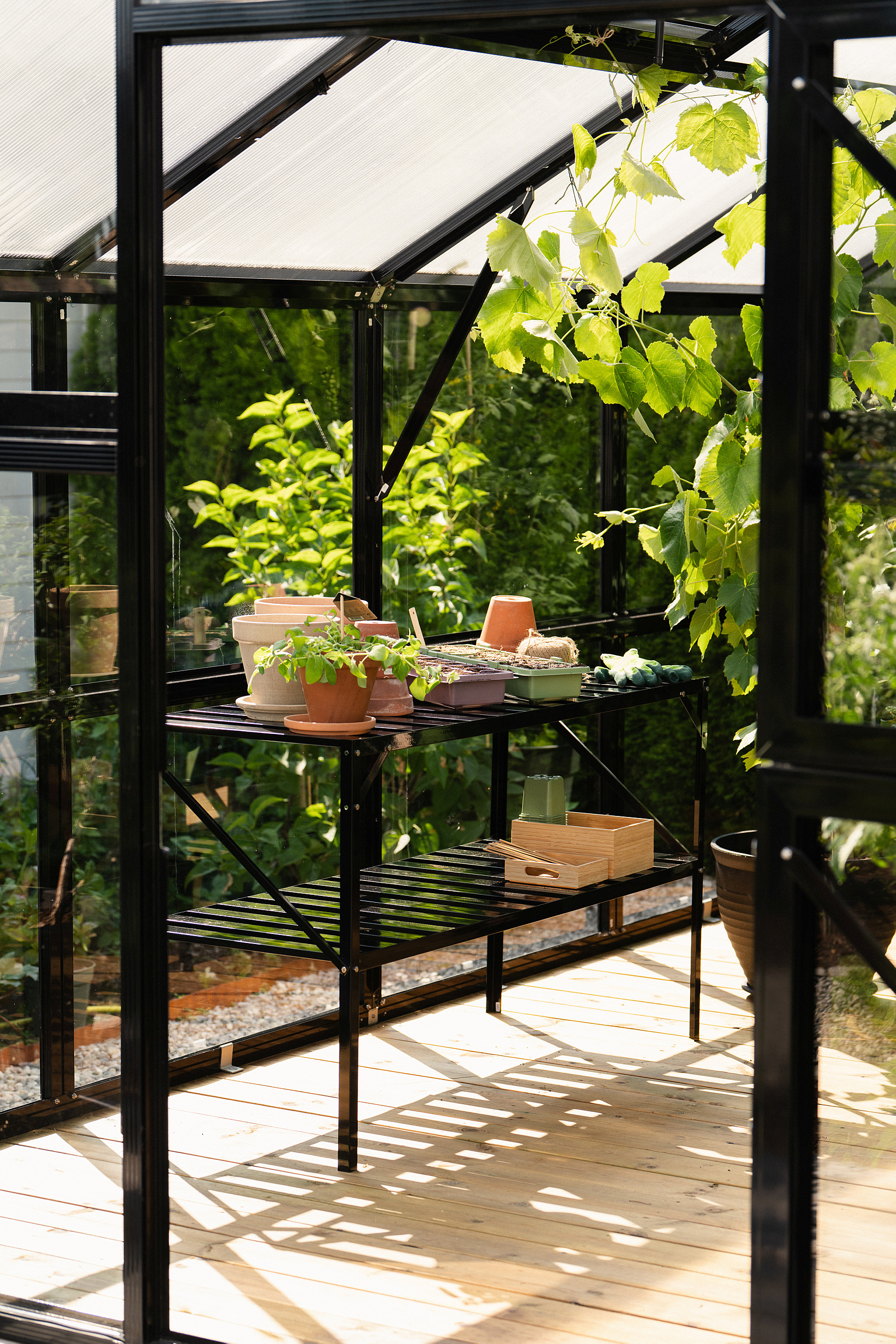 Lett, allsidig pulvertlakkert aluminiumsbord til bruk i drivhuset, boden eller terassen. Praktisk til forkultivering, ompotting og utvidelse av dyrkingsarealet.
