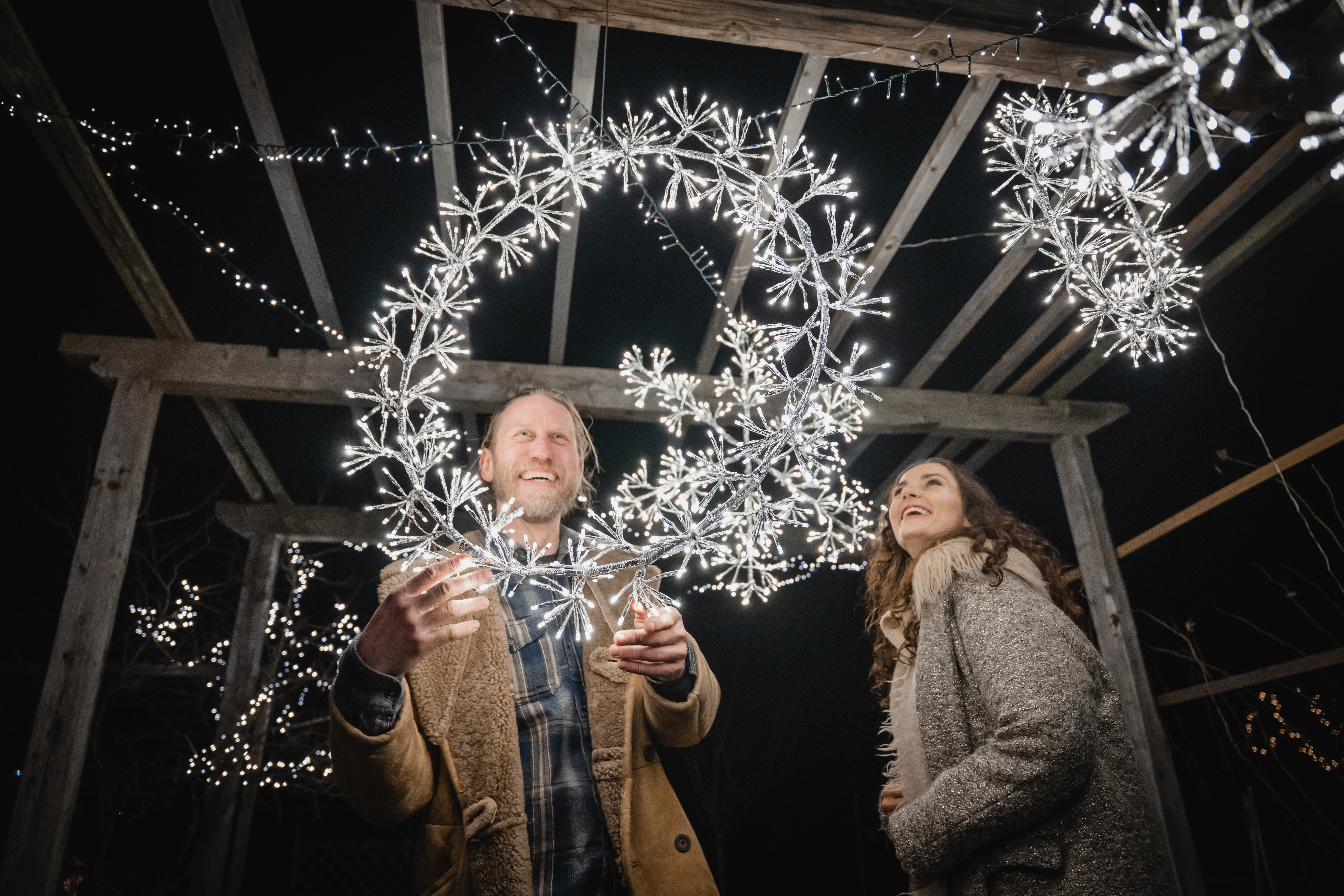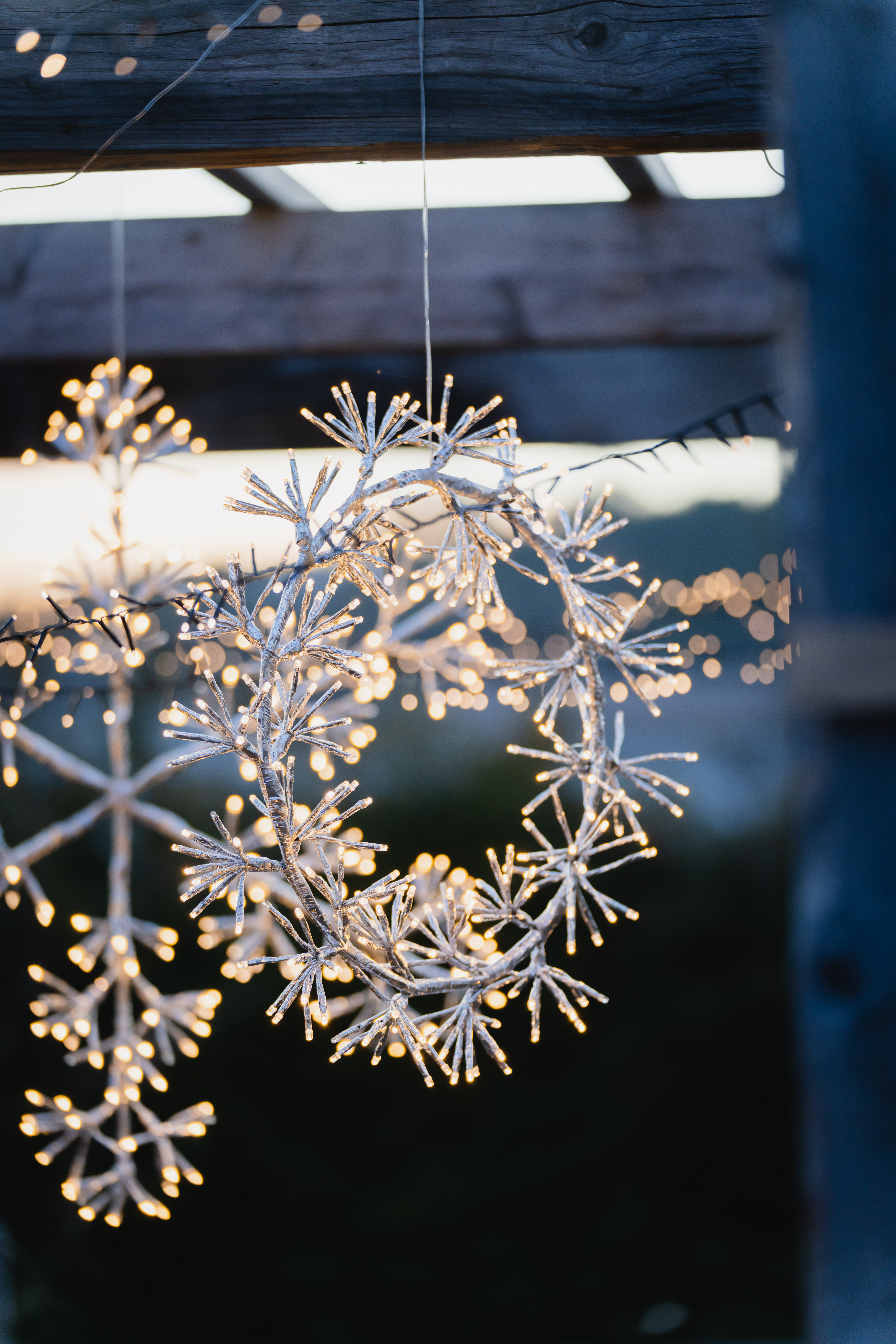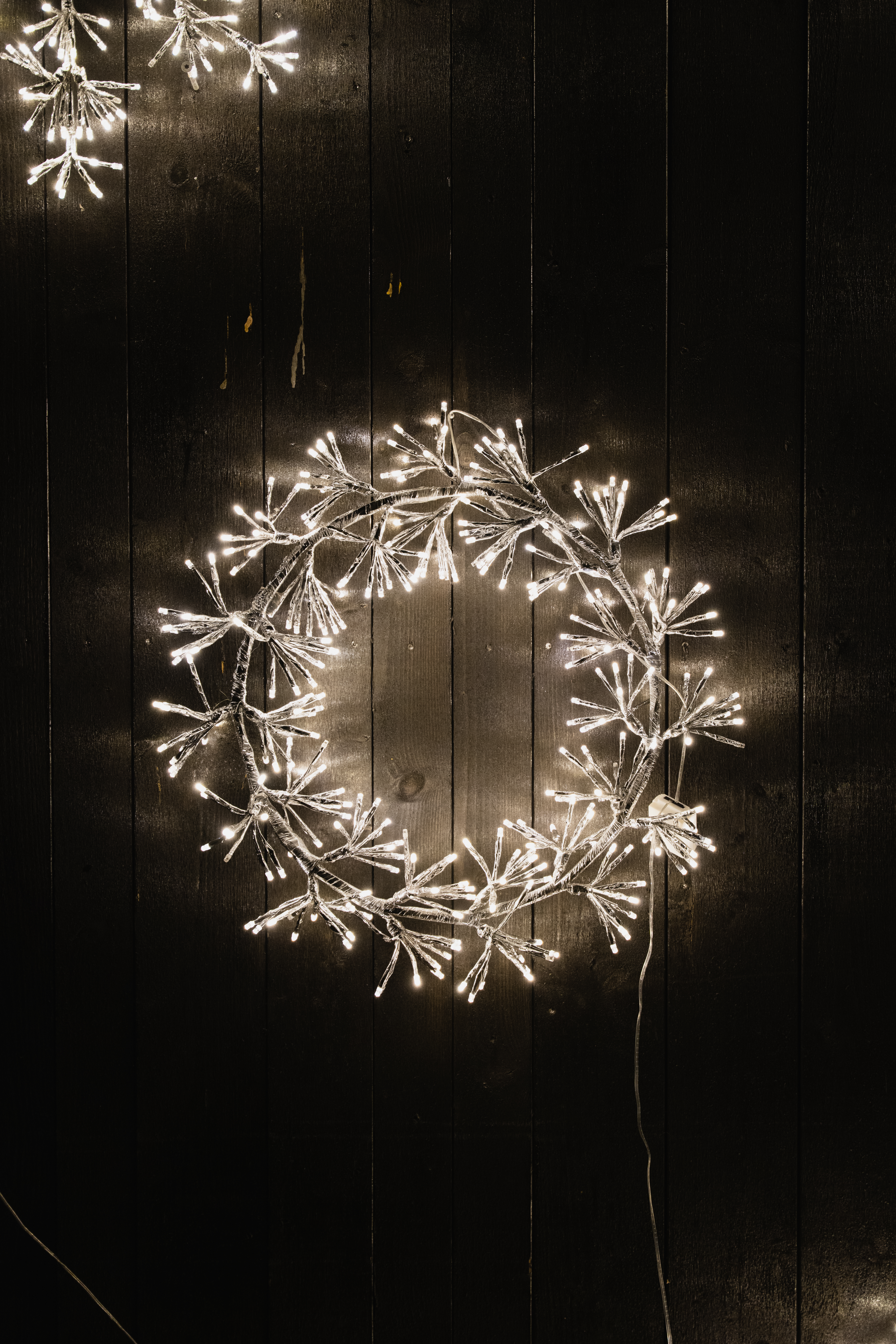 Vakker julebelysning, formet som en krans med 300 glitrende LEDlys. Ulike innstillinger på lys. Støpsel med 5 meter ledning. Med timer (8 timer på/16 timer av). Til innendørs og utendørs bruk.
