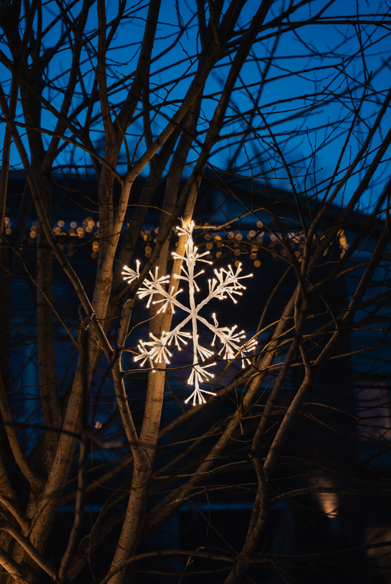 Lekker dekorbelysning formet som en snøkrystall. Hvit farge med LED lys. H78 cm. Med 8 timers timer funksjon.