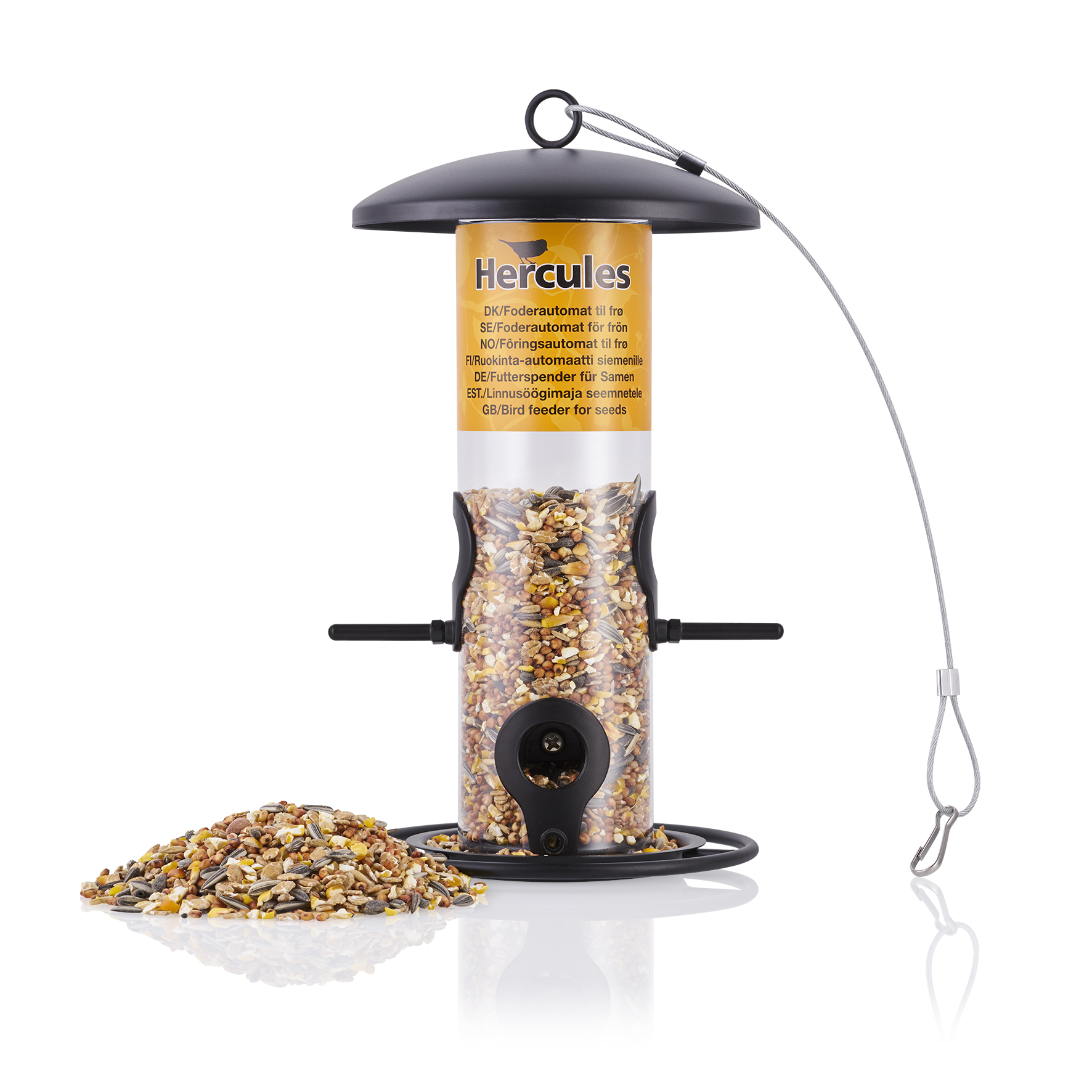 Hercules fuglefôrhus til frø er et stilrent og robust fôrhus laget i pulverlakkert sort metall. Det er designet for å tåle vær og vind, og passer perfekt til hagen eller balkongen. Med en praktisk opphengsvaier på 30 cm er det enkelt å plassere. Fôrhuset gir småfuglene enkel tilgang til frø, og bidrar til å skape liv og aktivitet i uterommet året rundt. Sørg for at fuglemateren er over bakkenivå slik at det ikke blir så enkelt for rovdyr eller katter å angripe fuglene mens de spiser.
