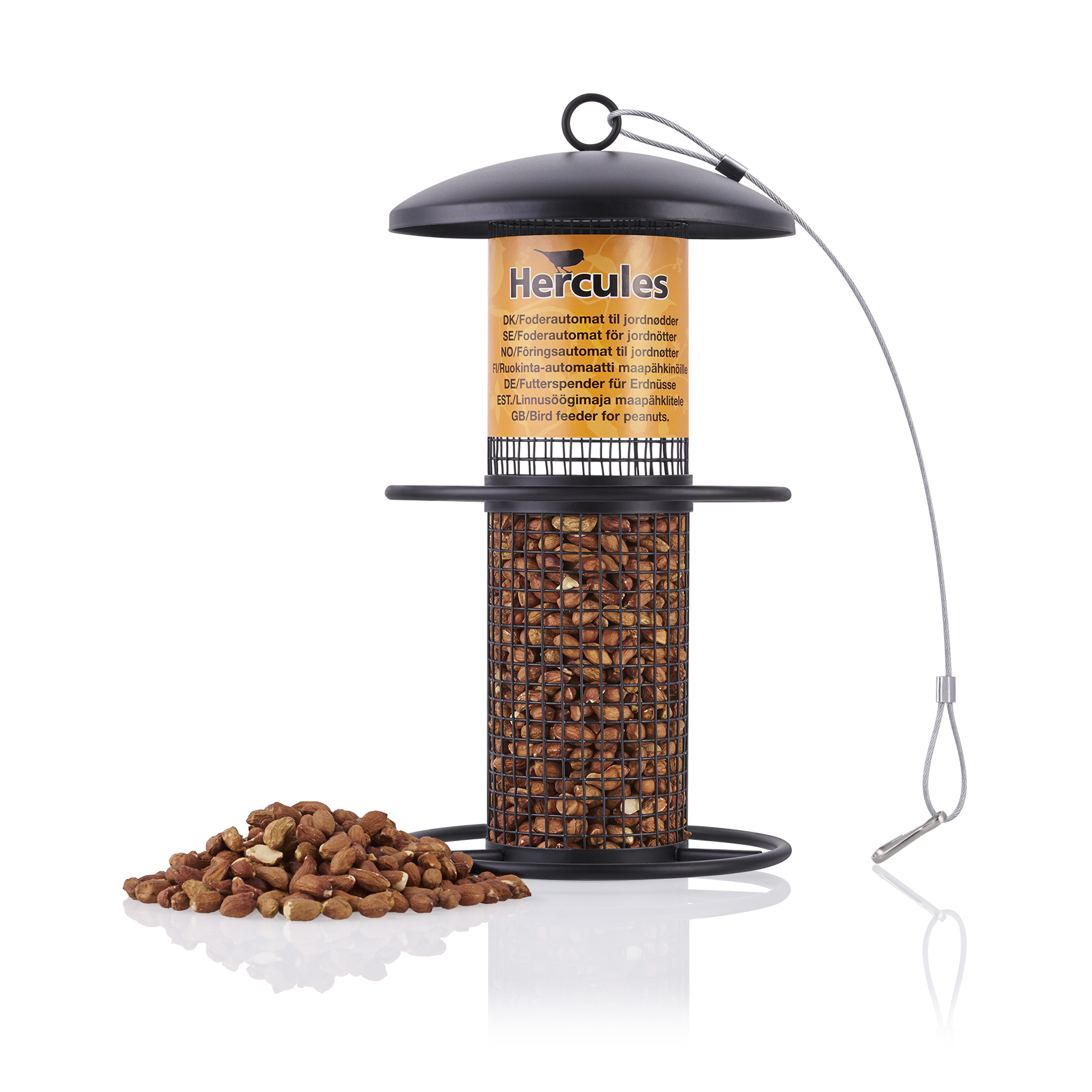 Hercules fuglefôrhus til peanøtter er et solid og stilrent fôrautomat laget i matt, sortlakkert metall. Den er spesielt utviklet for servering av peanøtter til småfugler, og gir enkel tilgang til næringsrik mat. Med en robust konstruksjon og en 30 cm lang opphengsvaier er den lett å plassere i hagen eller på balkongen. Fôrhuset tåler vær og vind, og tiltrekker livlige fugler året rundt. Sørg for at fuglemateren er over bakkenivå slik at det ikke blir så enkelt for rovdyr eller katter å angripe fuglene mens de spiser.