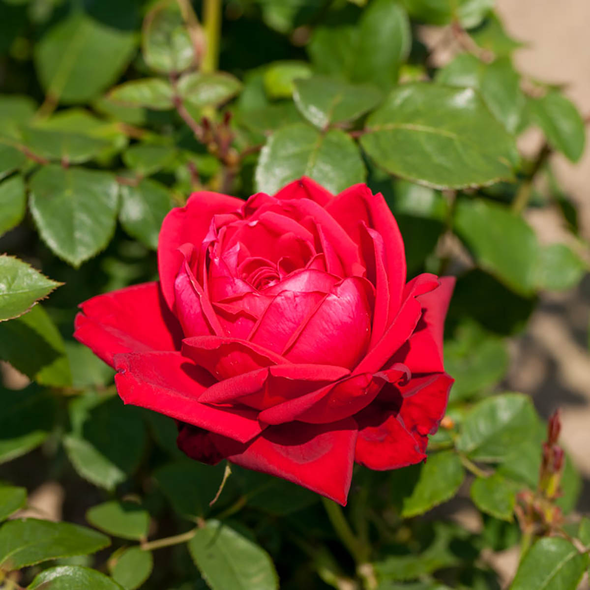 Stilkrose 'Burgund' blomstrer med meget store, dyprøde fylte blomster med middels duft. Kraftig opprett vekst med blanke blader. Sterk mot sykdommer. Plantes på et lunt og solrikt sted med god og næringsrik jord. Gjødsle med rosegjødsel jevnlig gjennom vekstsesongen. Klipp ned planten til ca 15 cm over bakken på våren for å sikre en kraftig vekst og forgreining. Hageland Kugjødselkompost og Hageland Rosejord anbefales ved planting.
